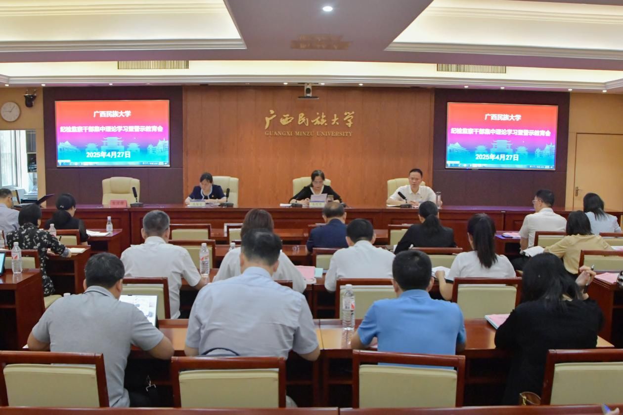 4月27日,自治区纪委监委驻校纪检监察组组长、校党委副书记、纪委书记韦雪芳主持纪检监察干部集中理论学习暨警示教育会,强调依托学科优势,发挥前瞻引领作用,群策群力规划发展布局,加强宣传思想文化工作集中领导,推动中华民族共同体意识深入人心,为铸牢中华民族共同体意识示范区建设贡献力量。(初审/李济权 复审/荣子卿 终审/孙寿媚)