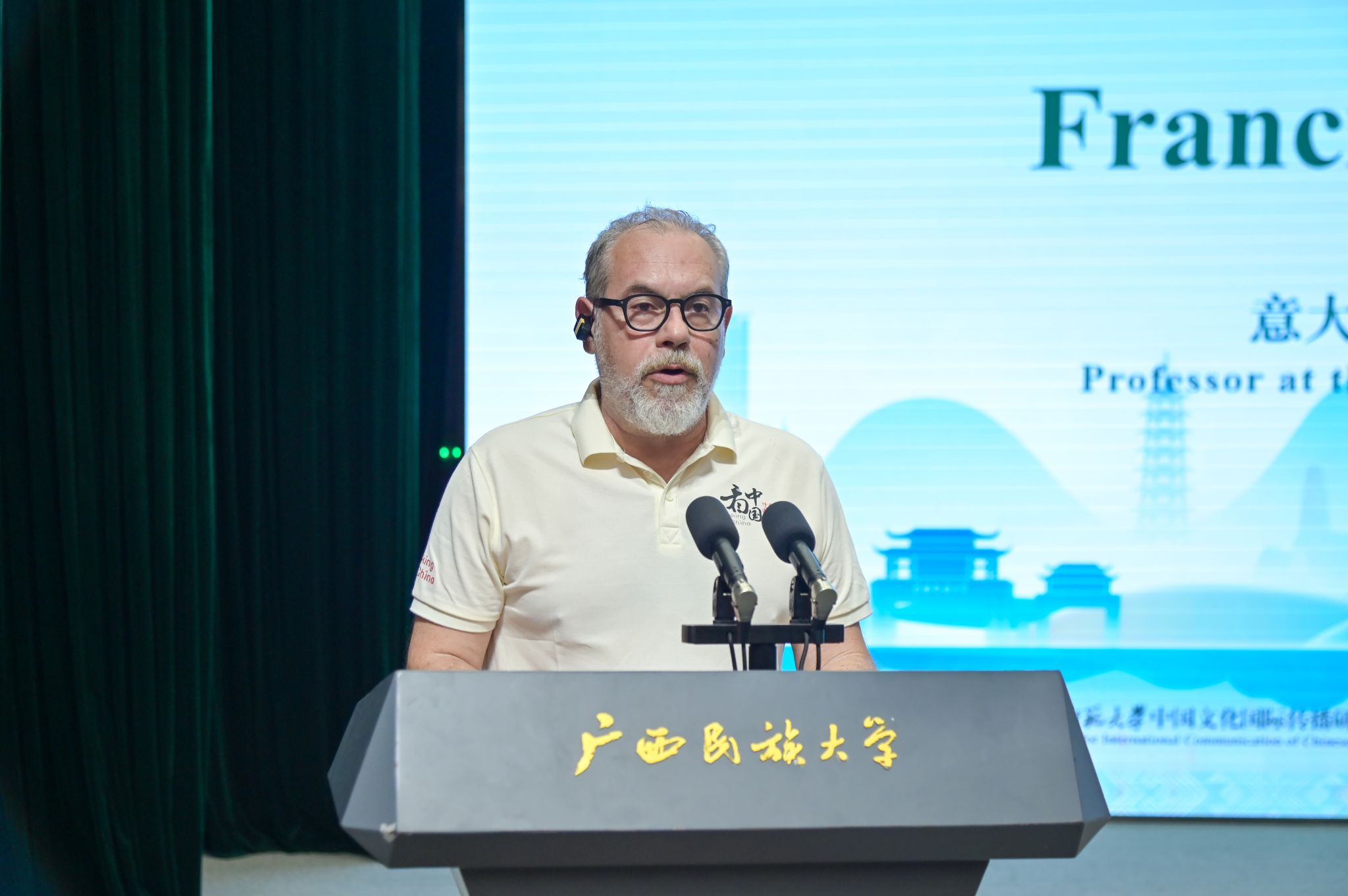 会上,中方指导教师代表、广西民族大学传媒学院教师周嘉泰,外方青年创作者代表、意大利青年导演卢多维卡·萨尔维(Ludovica Salvi),中方学生代表、广西民族大学传媒学院硕士生何泽昊等作了发言。