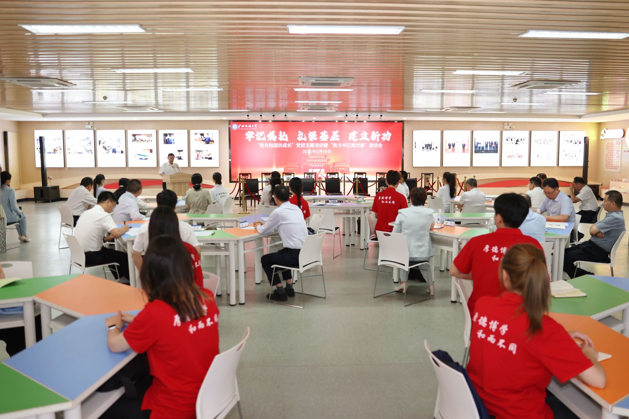 【大学生通讯社报道】5月10日下午,广西民族大学举行“我与祖国共成长”党团主题活动暨“我与书记面对面”座谈会。校党委书记卞成林,党委副书记、校长韦仕珍出席活动,全体在家校领导及有关职能部门负责人、师生代表、校友代表参加活动。