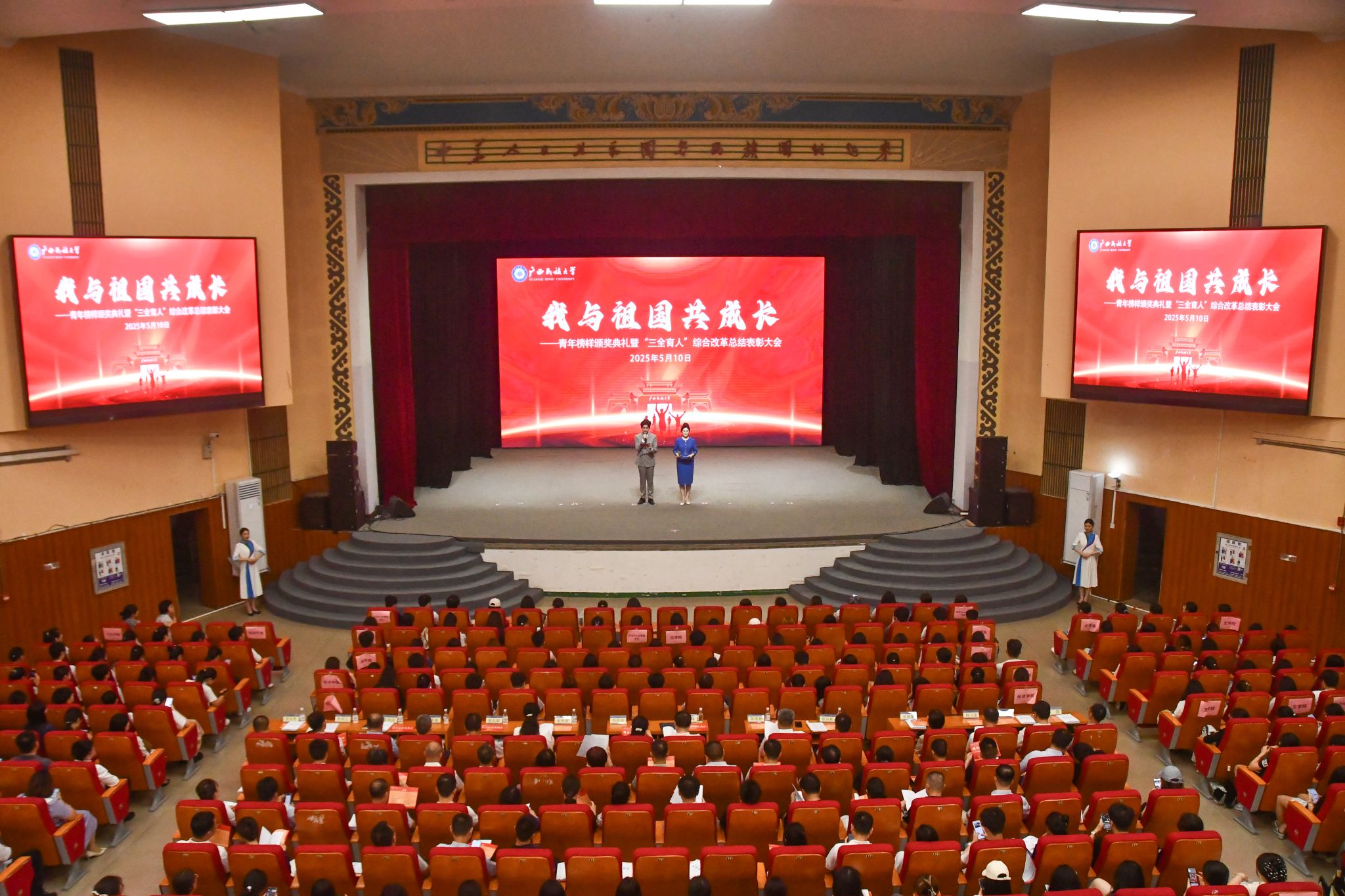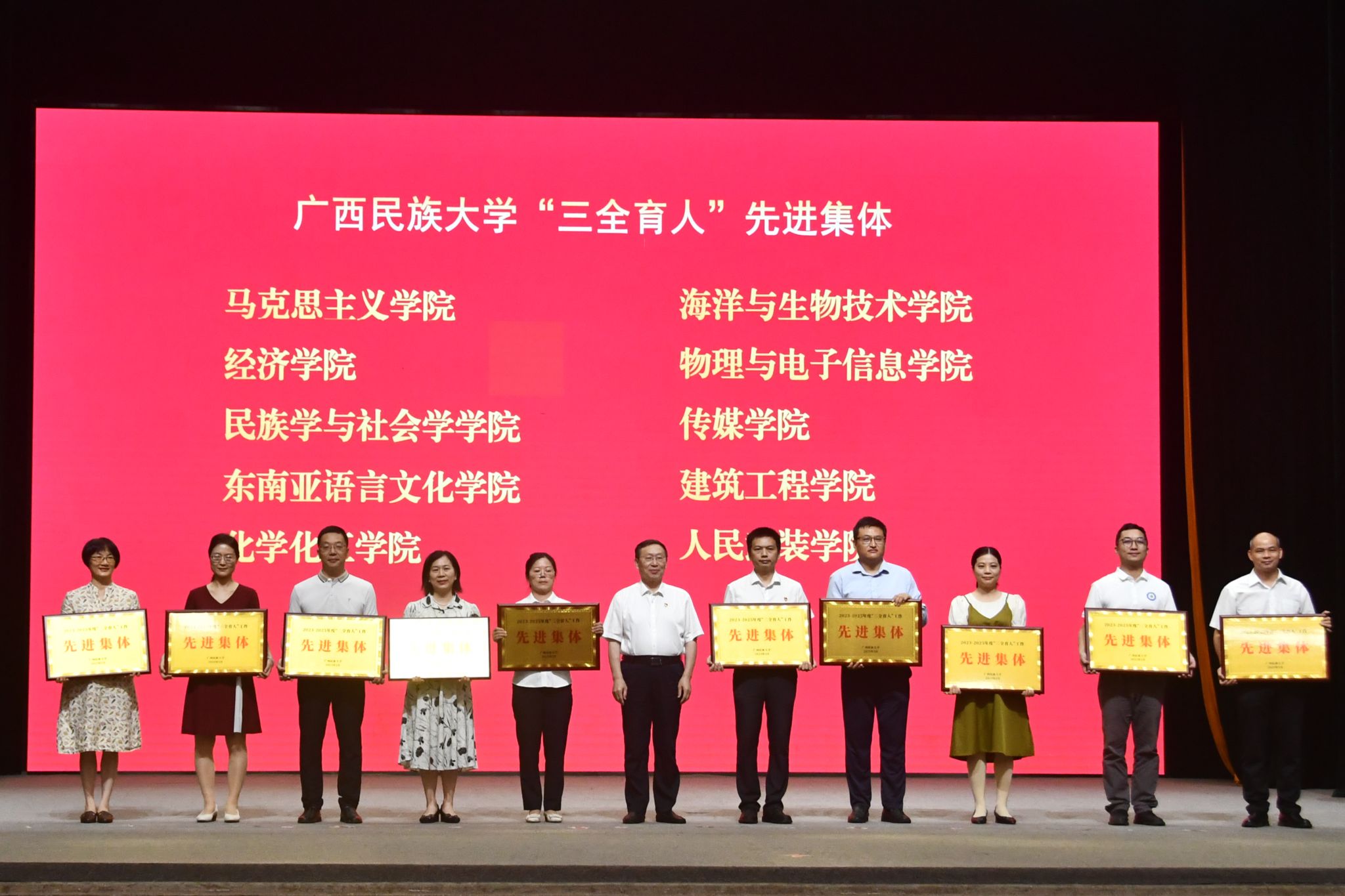 【大学生通讯社报道】5月10日下午,广西民族大学在相思湖校区大礼堂举行“我与祖国共成长”青年榜样颁奖典礼暨“三全育人”综合改革总结表彰大会。校党委书记卞成林,校党委副书记、校长韦仕珍出席典礼,全体在家校领导及师生代表参加。