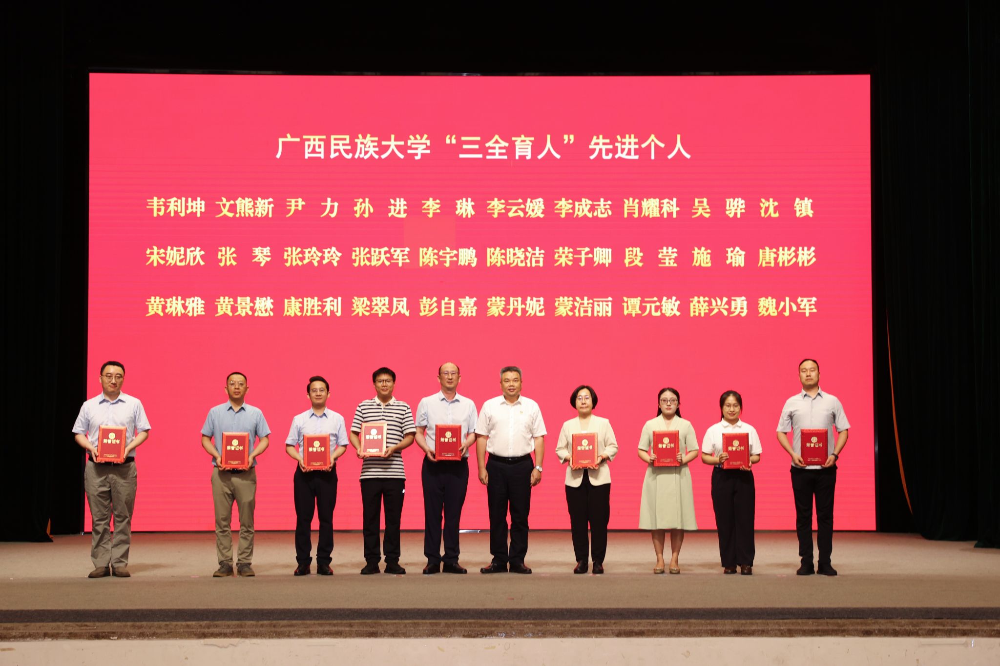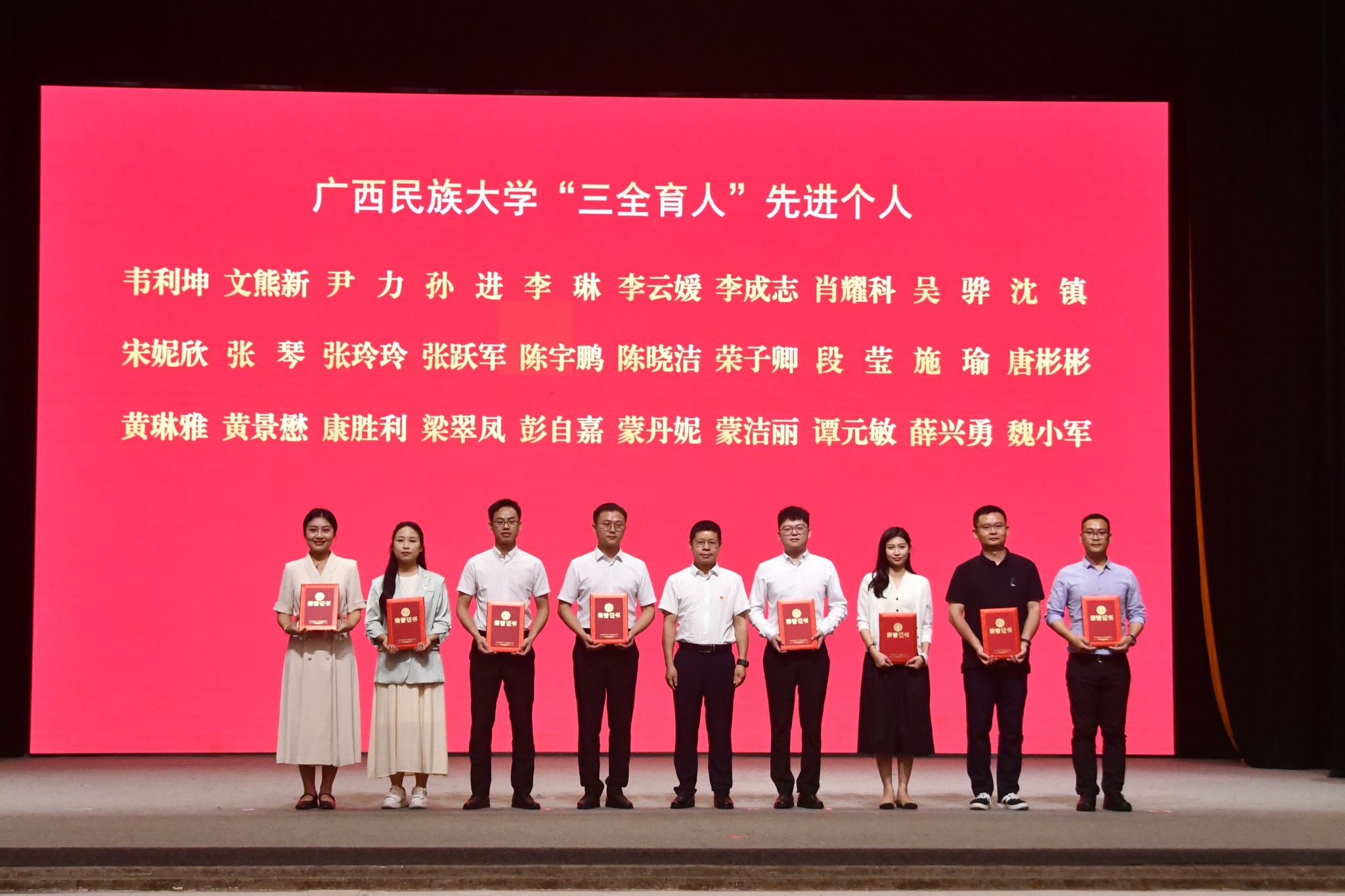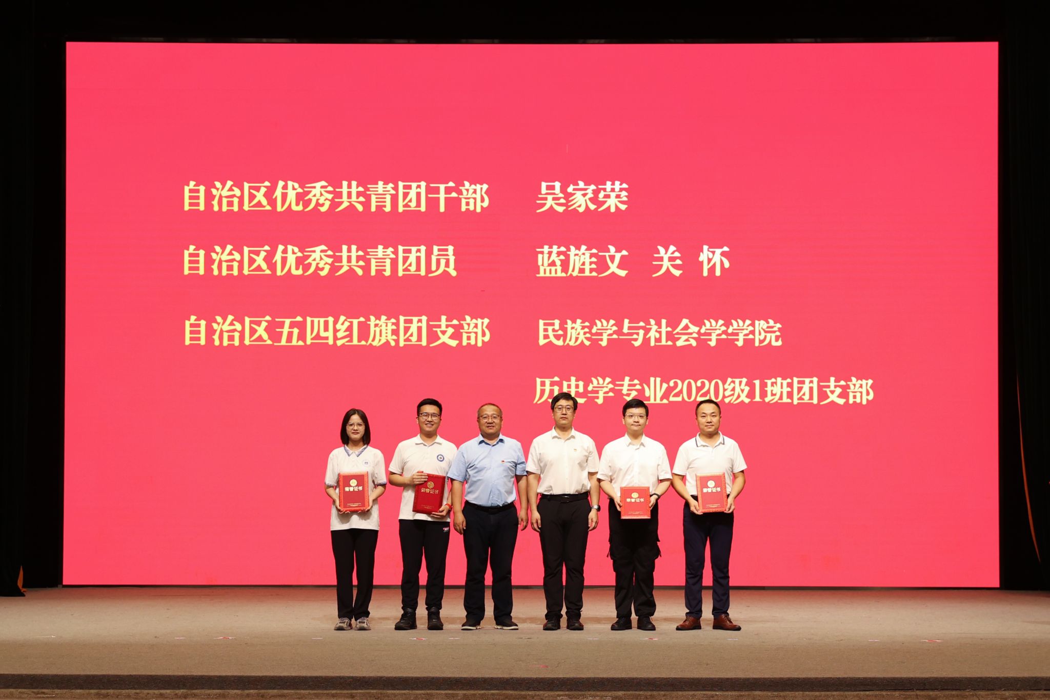 校领导分别为自治区优秀共青团干部、自治区优秀共青团员、广西五四红旗团支部、国家励志奖学金代表、国家奖学金代表、“三全育人”先进个人、“三全育人”先进集体颁奖。