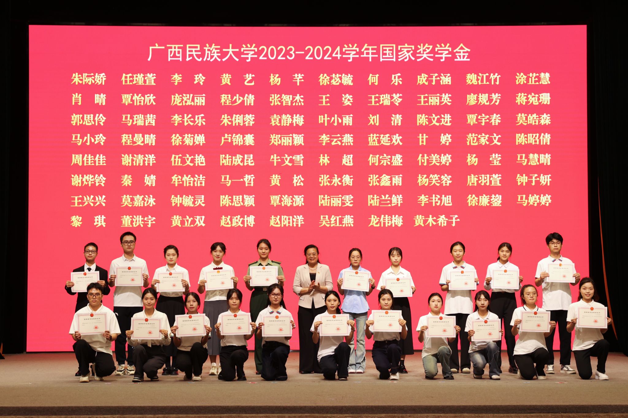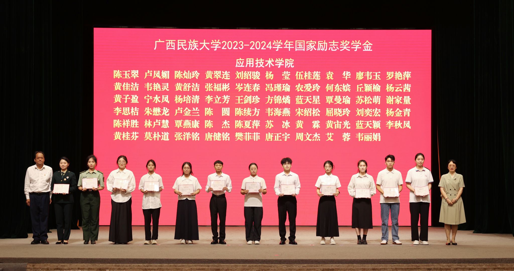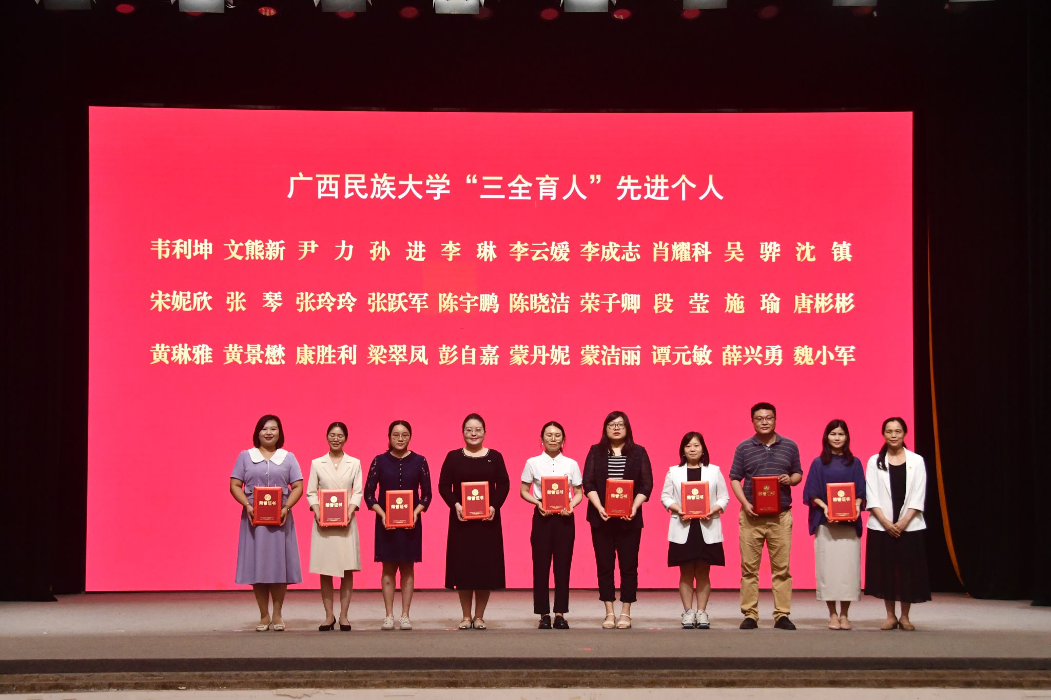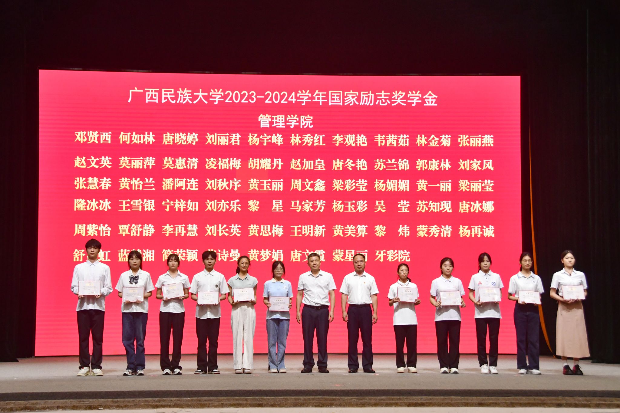校领导分别为自治区优秀共青团干部、自治区优秀共青团员、广西五四红旗团支部、国家励志奖学金代表、国家奖学金代表、“三全育人”先进个人、“三全育人”先进集体颁奖。