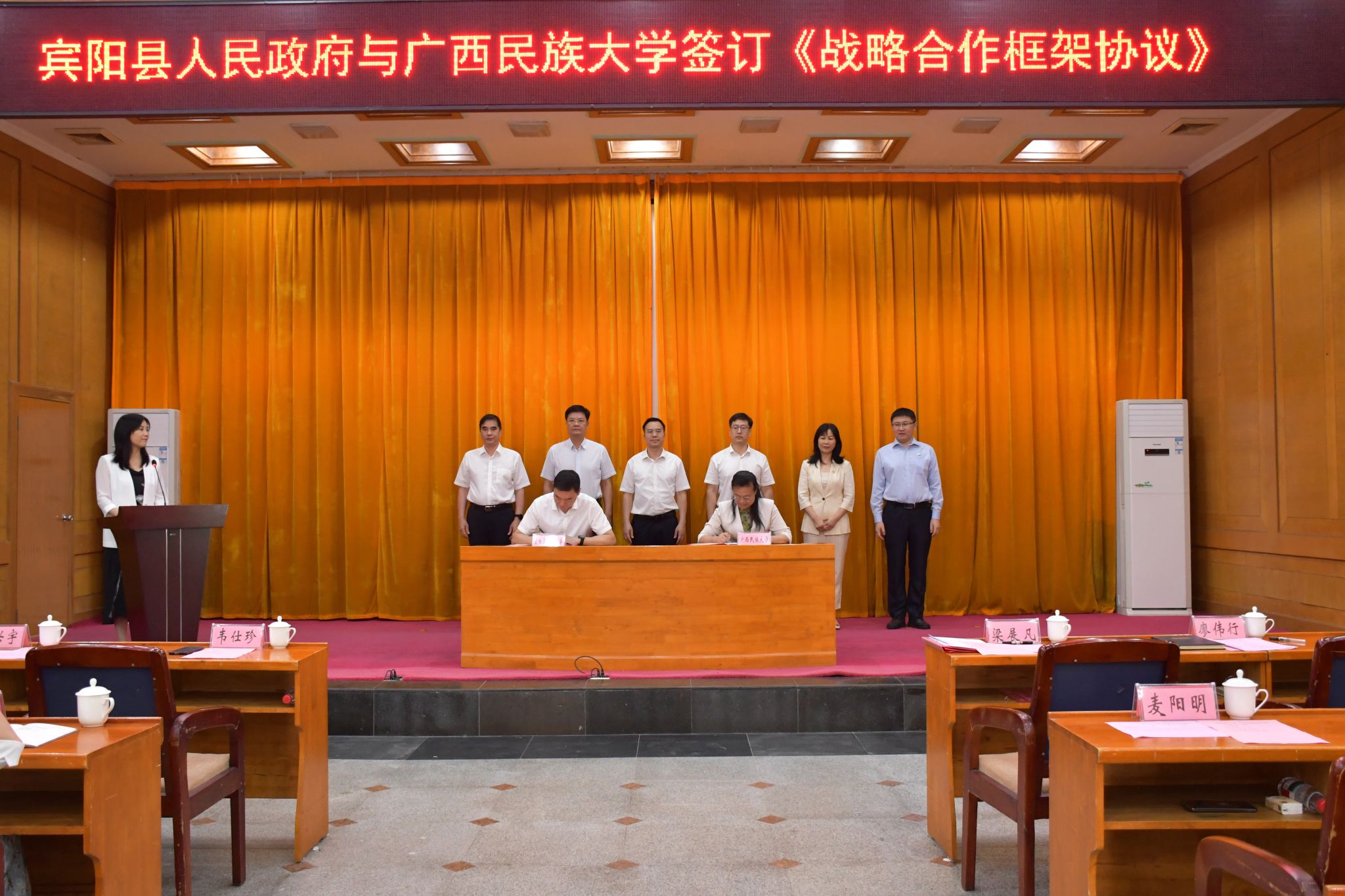 5月13日上午,广西民族大学与宾阳县人民政府战略合作框架协议签约仪式在宾阳县委县政府接待中心举行。广西民族大学党委副书记、校长韦仕珍,副校长高兴宇,宾阳县委书记梁展凡,县长廖伟行出席仪式。宾阳县委常委、统战部部长李春亮主持签约仪式。