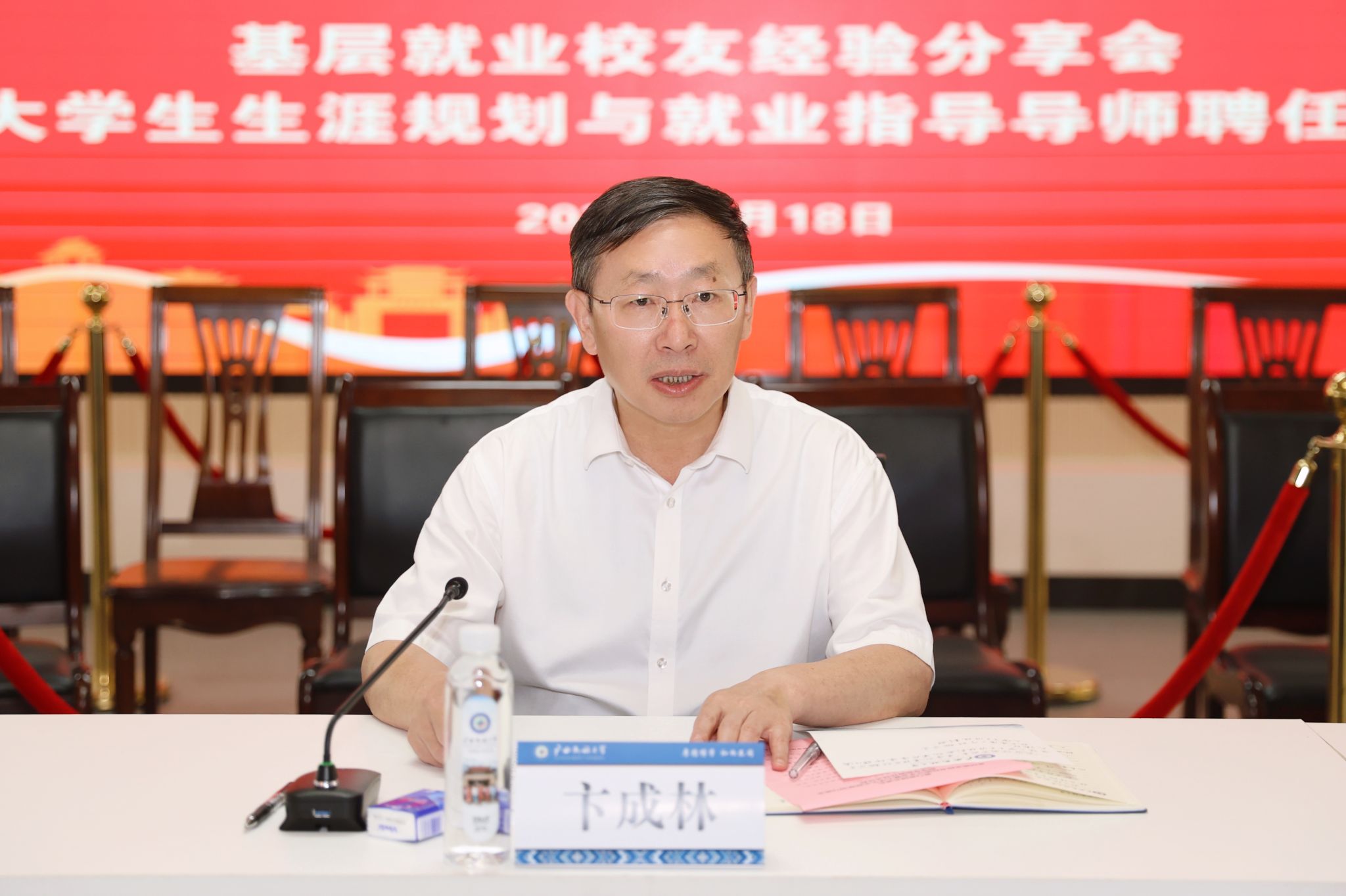 卞成林对同学们提出三点要求。一是扎根基层沃土,锤炼实干之能,积极转变就业观念,把握边疆民族地区发展机遇,在服务国家战略中实现人生价值;二是筑牢理想信念根基,擦亮初心底色,秉持“厚德”精神,坚守初心、服务群众,自觉将个人理想追求融入到实现中华民族伟大复兴的中国梦之中;三是涵养家国情怀,挺膺担当,以“国之大者”为人生航向,争当基层排头兵,在乡村振兴上创业绩,成就自我,奉献国家。