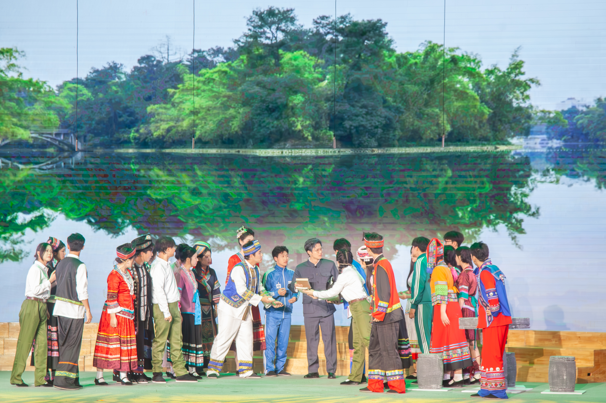 广西民族大学话剧团表演了《校友莫振高》片段《湖畔求学》,该话剧由学校师生创作排演,以舞台表演、朗诵等形式,生动再现了校友莫振高在广西民族大学求学期间,惜时如金、虚心好学、乐于助人的情景。