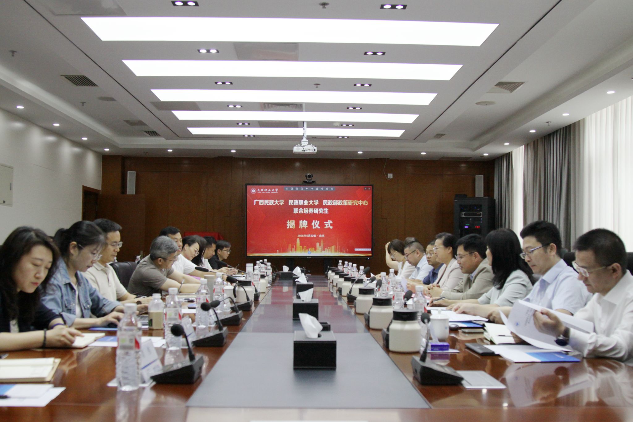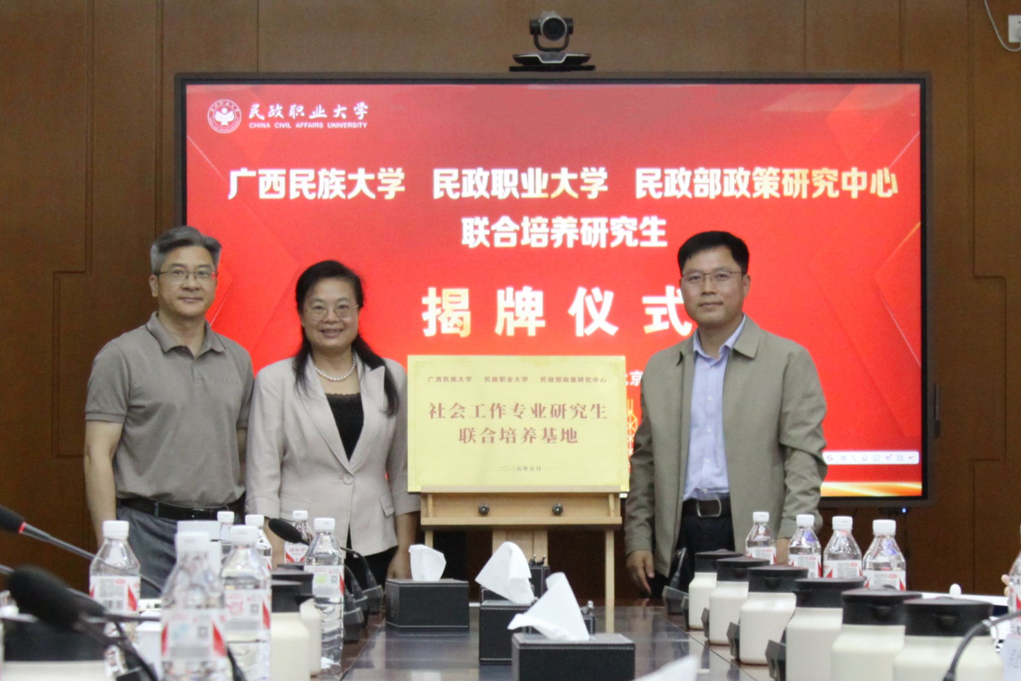 5月22日,广西民族大学、民政职业大学、民政部政策研究中心共建“社会工作专业研究生联合培养基地”揭牌仪式在民政职业大学综合楼举行。广西民族大学校长韦仕珍,民政职业大学校长李绚,民政部政策研究中心综合研究室主任侯新毅出席会议并分别致辞。