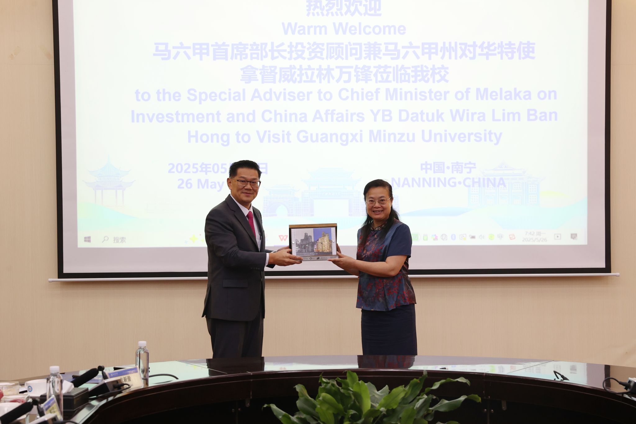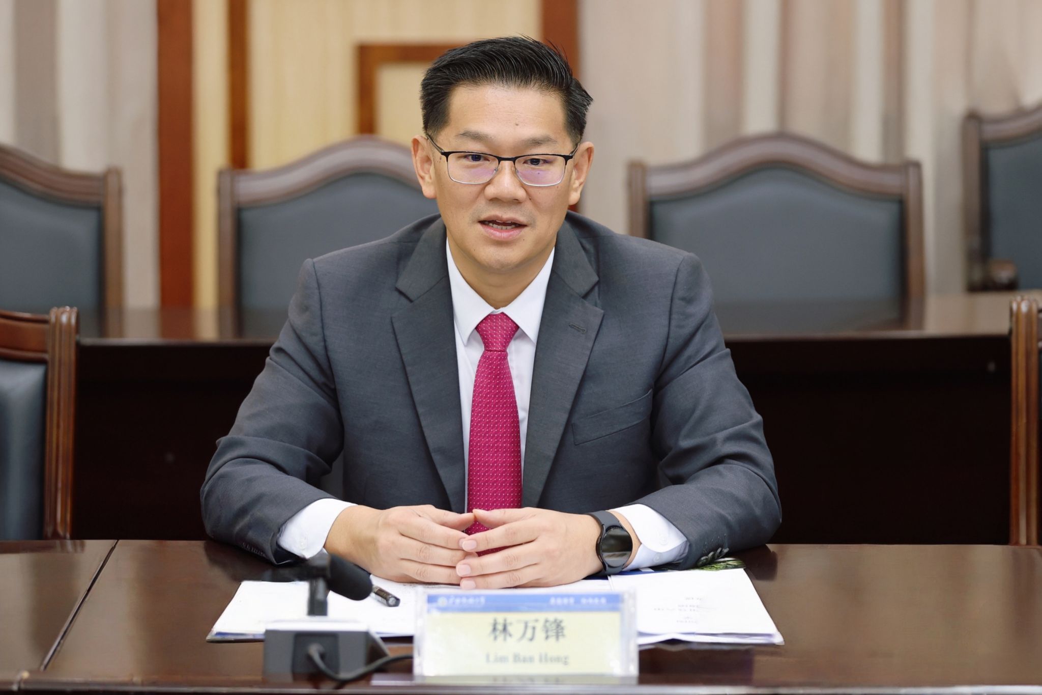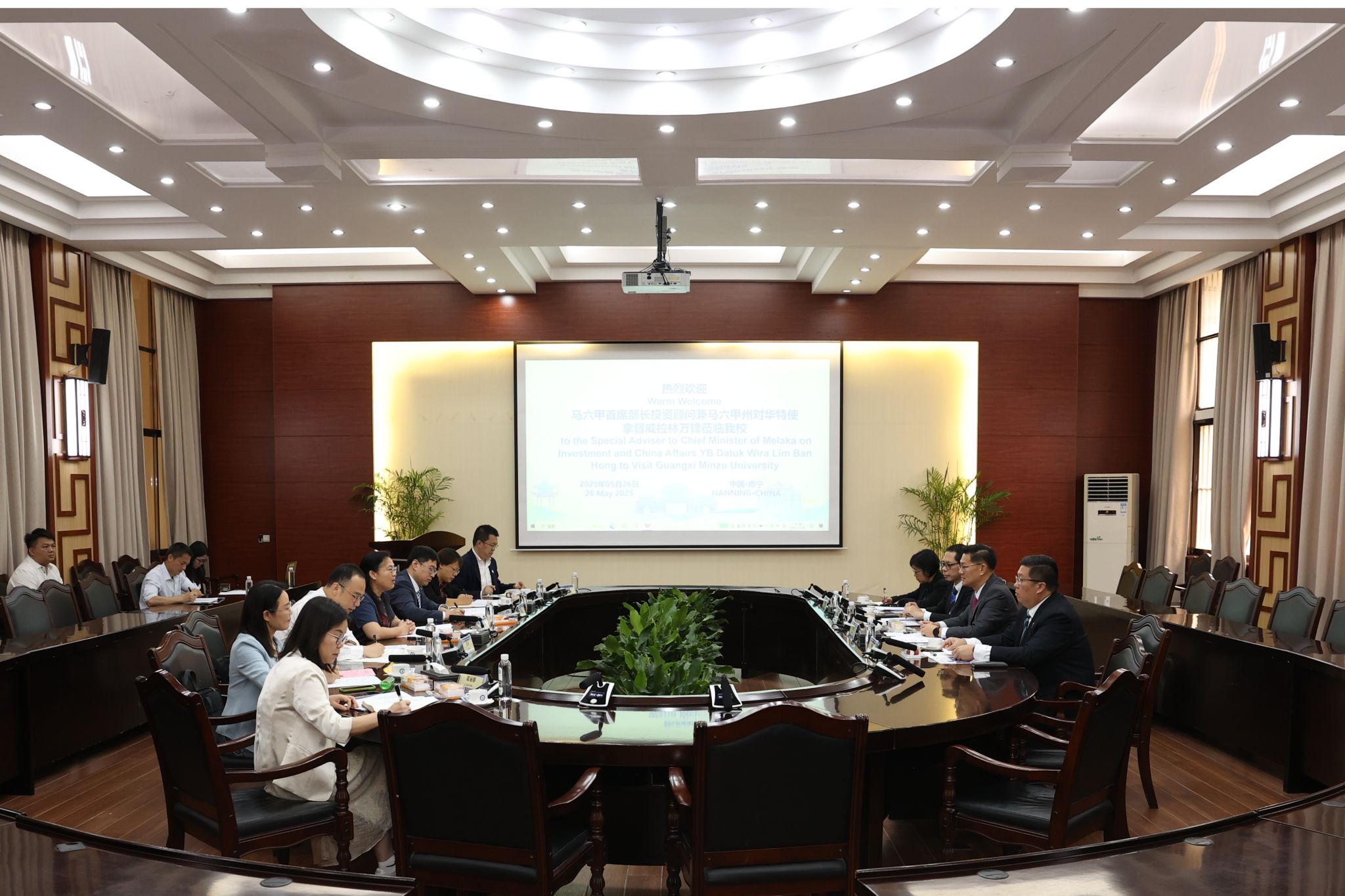 林万锋对广西民族大学在国际化办学和区域研究方面取得成果表示赞赏,简要介绍了马六甲州经济发展、文化教育等领域发展情况。林万锋希望双方以教育合作为桥梁,进一步拓展在人工智能领域、郑和文化研究等方面的交流合作,实现互利共赢、共同发展。