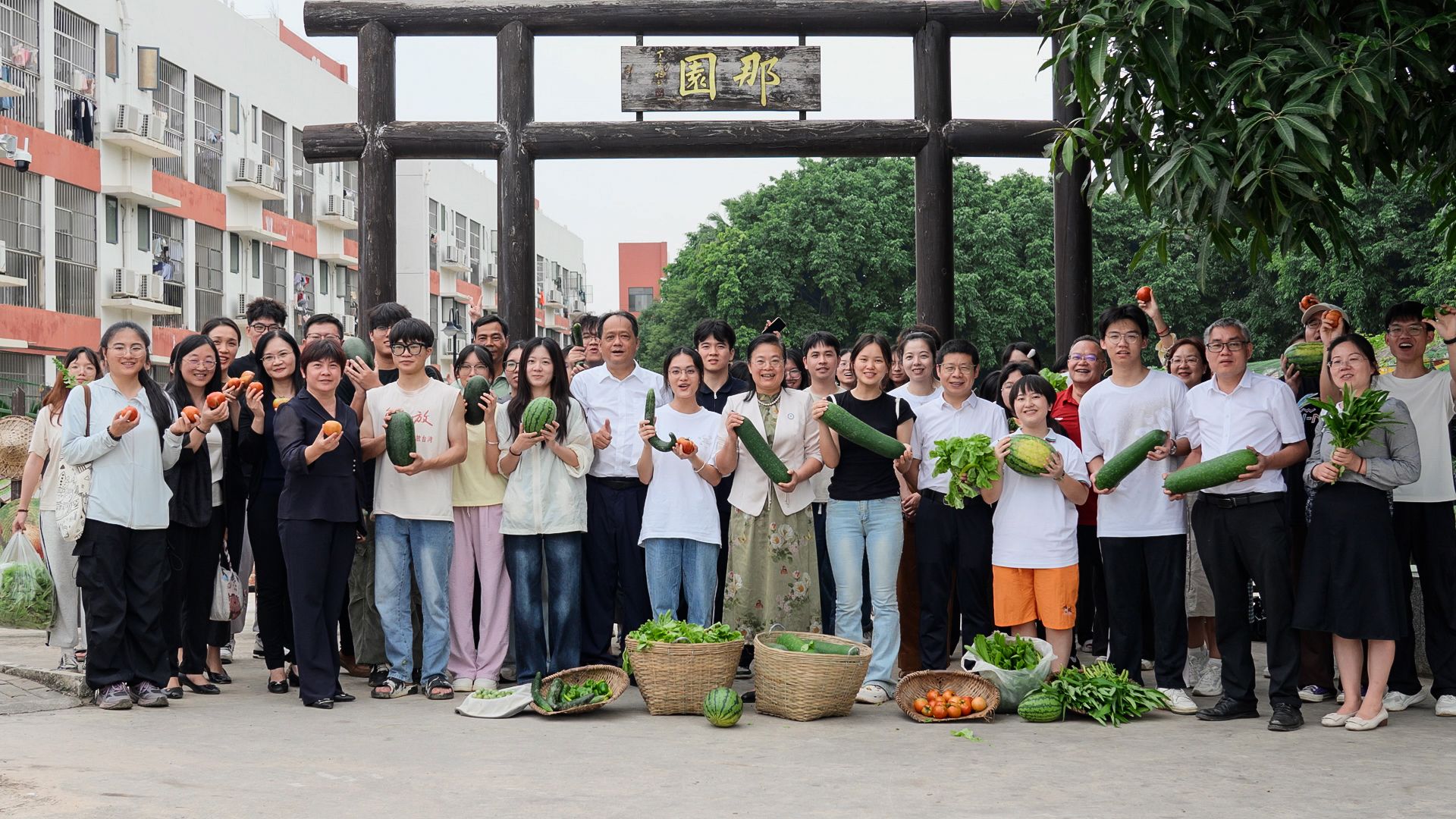 师生们一同在那园除草,采摘成熟的蔬菜瓜果,劳动现场其乐融融,洋溢着收获的喜悦。