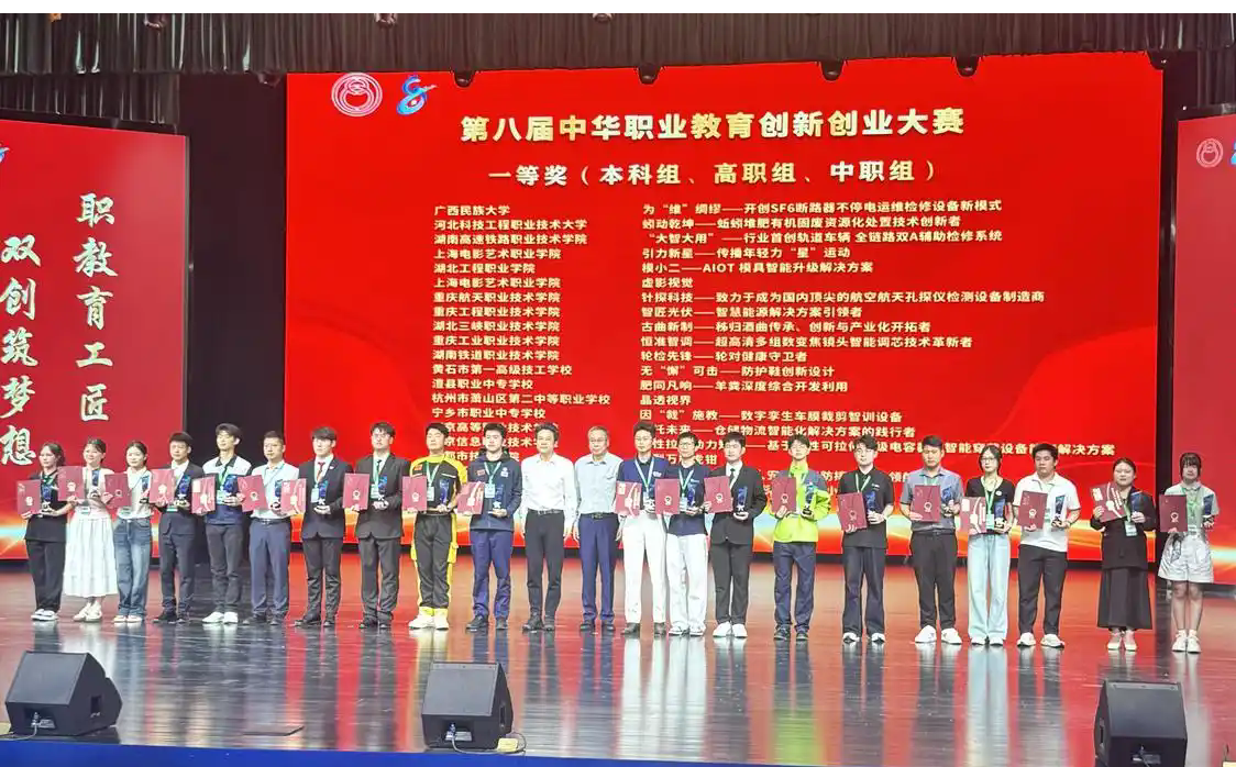 近日,第八届中华职业教育创新创业大赛全国现场总决赛在湖北黄石举行。广西民族大学应用技术学院2024级自动化专业张籍文领衔的项目“为‘维’绸缪——开创SF6断路器不停电运维检修设备新模式”斩获一等奖。