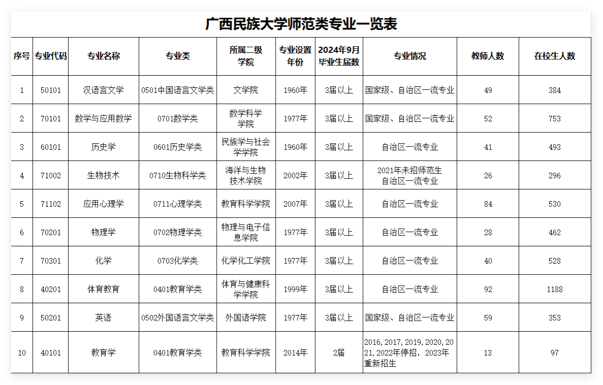 长期以来,广西民族大学坚守“为民族地区育良师,为民族团结铸根基”的初心使命,坚持“民族为根,师能为本”的育人理念,深耕师范生培养改革。学校以师范类专业认证为牵引,系统构建“通识教育+学科专业+教师教育+实践创新”四位一体课程体系,融入民族理论、名师案例与乡村教育实践,厚植师范生家国情怀与教育初心;深化校地协同育人,共建实践基地百余个,创新“双导师”指导模式,强化教学技能与职业素养;建立“评价—反馈—改进”质量闭环,推动人才培养与基础教育需求精准对接。近年来,学校师范生在省级以上竞赛中屡获佳绩,多个专业入选国家级、省级一流本科建设点,多项教学成果获省级奖项,为民族地区基础教育高质量发展注入强劲动力。现有师范类专业10个,其中国家级、省级一流本科专业建设点9个。