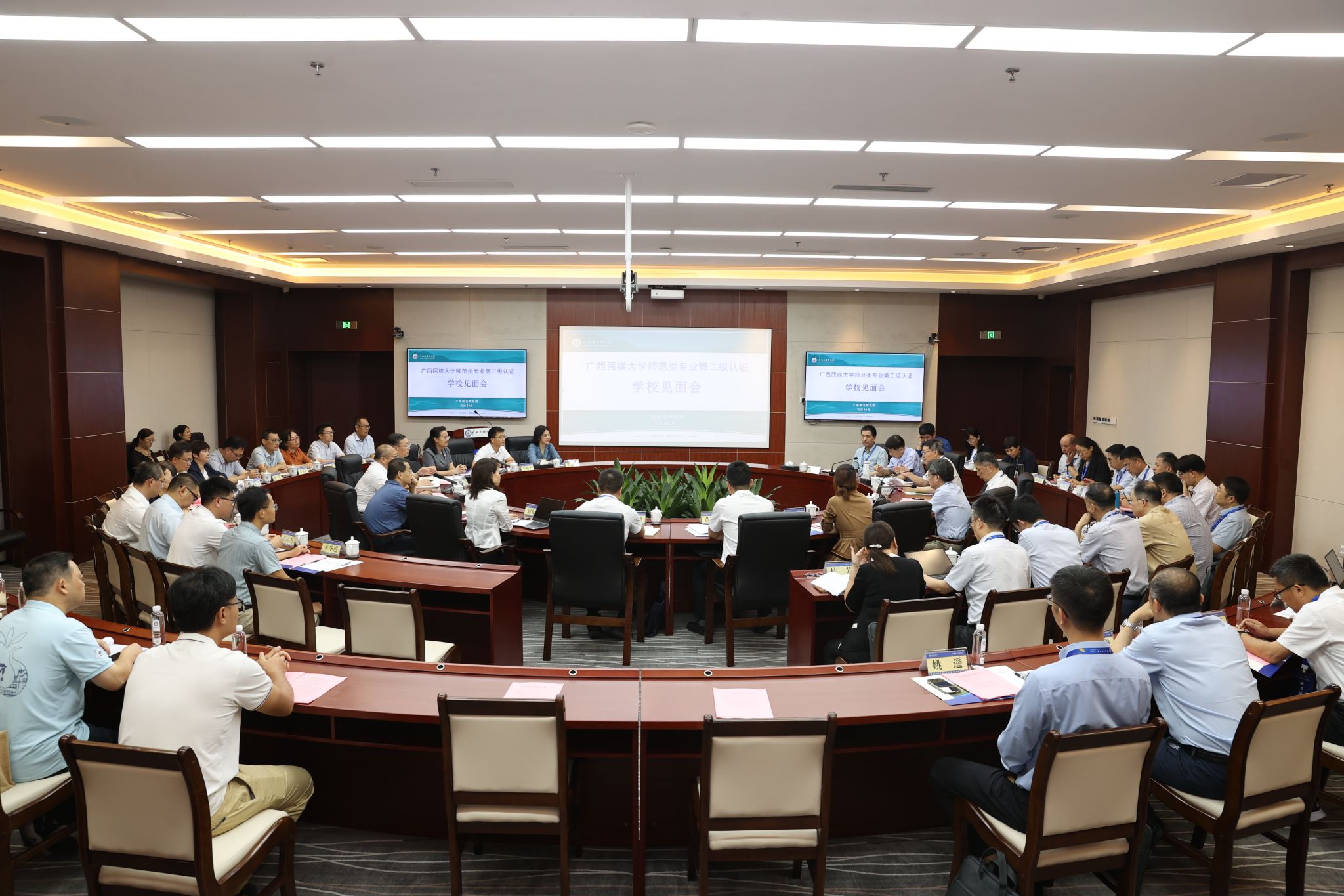 6月12日上午,现场考查专家见面会于广西民族大学文化研习基地二楼会议室召开。联合认证组组长林松柏主持会议,校党委书记卞成林,校长韦仕珍,副校长姜明国出席会议。学校有关部门及认证专业学院、广西教育研究院有关负责人与会。