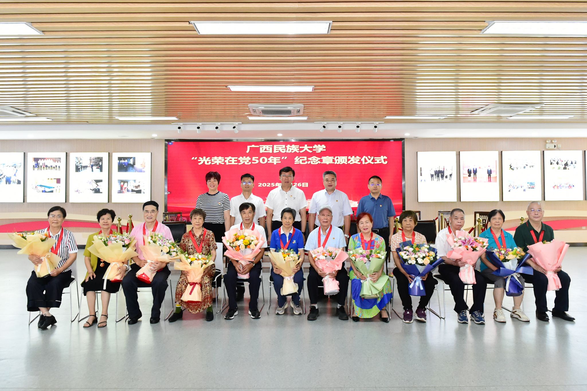 6月26日,在中国共产党成立104周年之际,广西民族大学2025年“光荣在党50年”纪念章颁发仪式在新时代“我与祖国共成长”党团主题活动文明实践所举行。校党委书记唐平秋出席仪式,党委副书记陈铭彬主持仪式,纪念章获得者代表及有关部门负责人参加仪式。