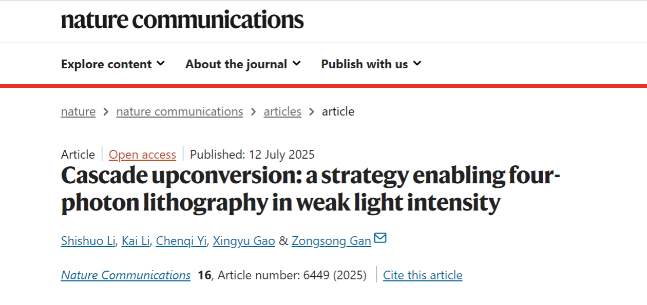 近日,由广西民族大学高兴宇教授和华中科技大学科研团队合作的研究成果,Cascade upconversion: a strategy enabling four-photon lithography in weak light intensity(《级联上转换:弱光四光子上转换光刻新策略》)发表在Nature Communications上。