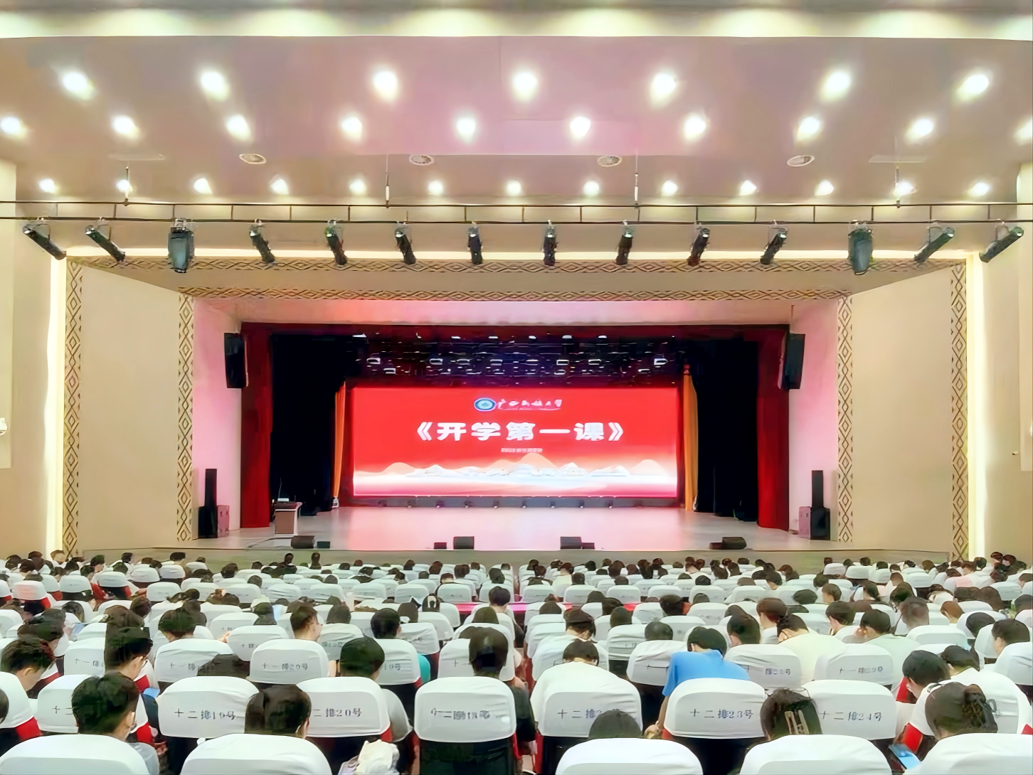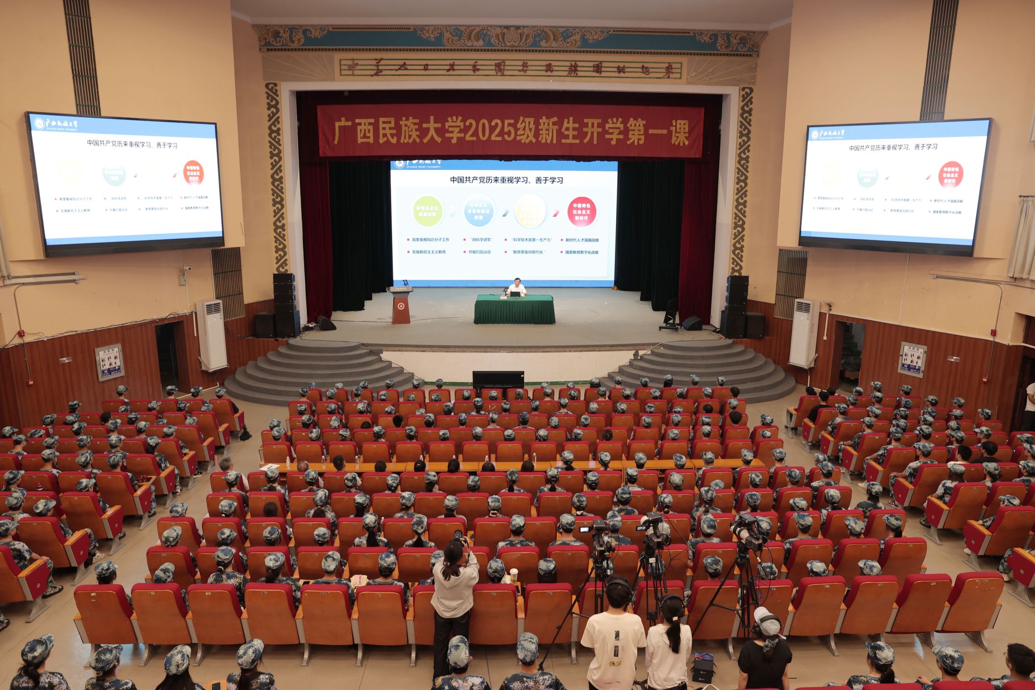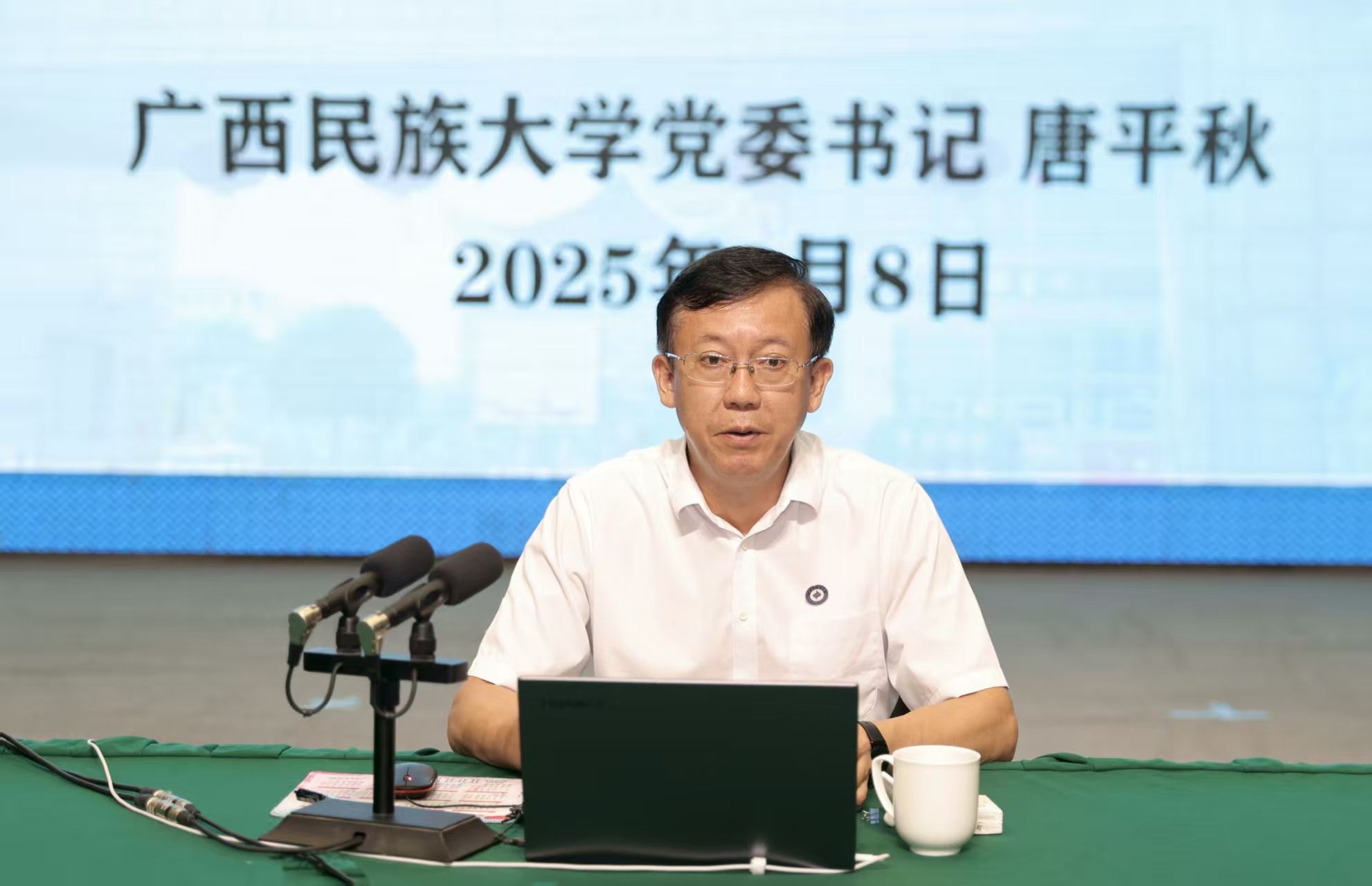 【大学生通讯社报道】9月8日晚,广西民族大学2025级新生“开学第一课”在相思湖校区、思源湖校区、武鸣校区同步举行。校党委书记唐平秋围绕“以学习为帆,在青春的征程中引领人生航向”作专题讲授,2025级全体新生同上“开学第一课”。