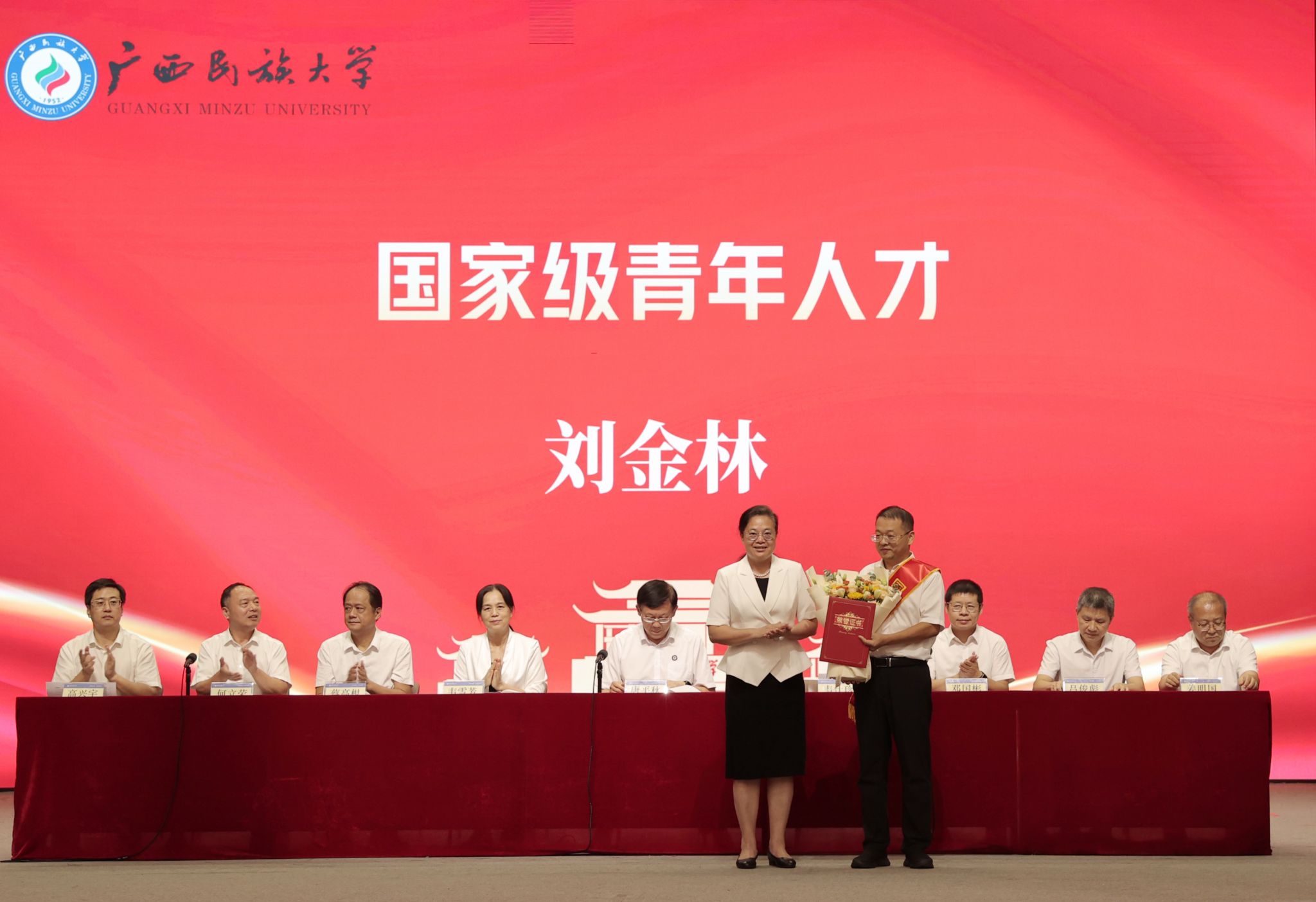 党委书记唐平秋为2024年全国“模范教师”雷湘竹教授颁发荣誉证书,党委副书记、校长韦仕珍为国家级青年人才刘金林教授颁发荣誉证书,校领导为2025年全国高校教师教学创新大赛获奖者、2024年自治区“模范教师”、2024年广西“最美高校辅导员”“高校辅导员年度人物”、2025年“自治区优秀退役军人”,以及学校2023—2025年“模范教师”“优秀教师”“优秀教育工作者”“从事教育工作30年”获奖者代表颁发证书。