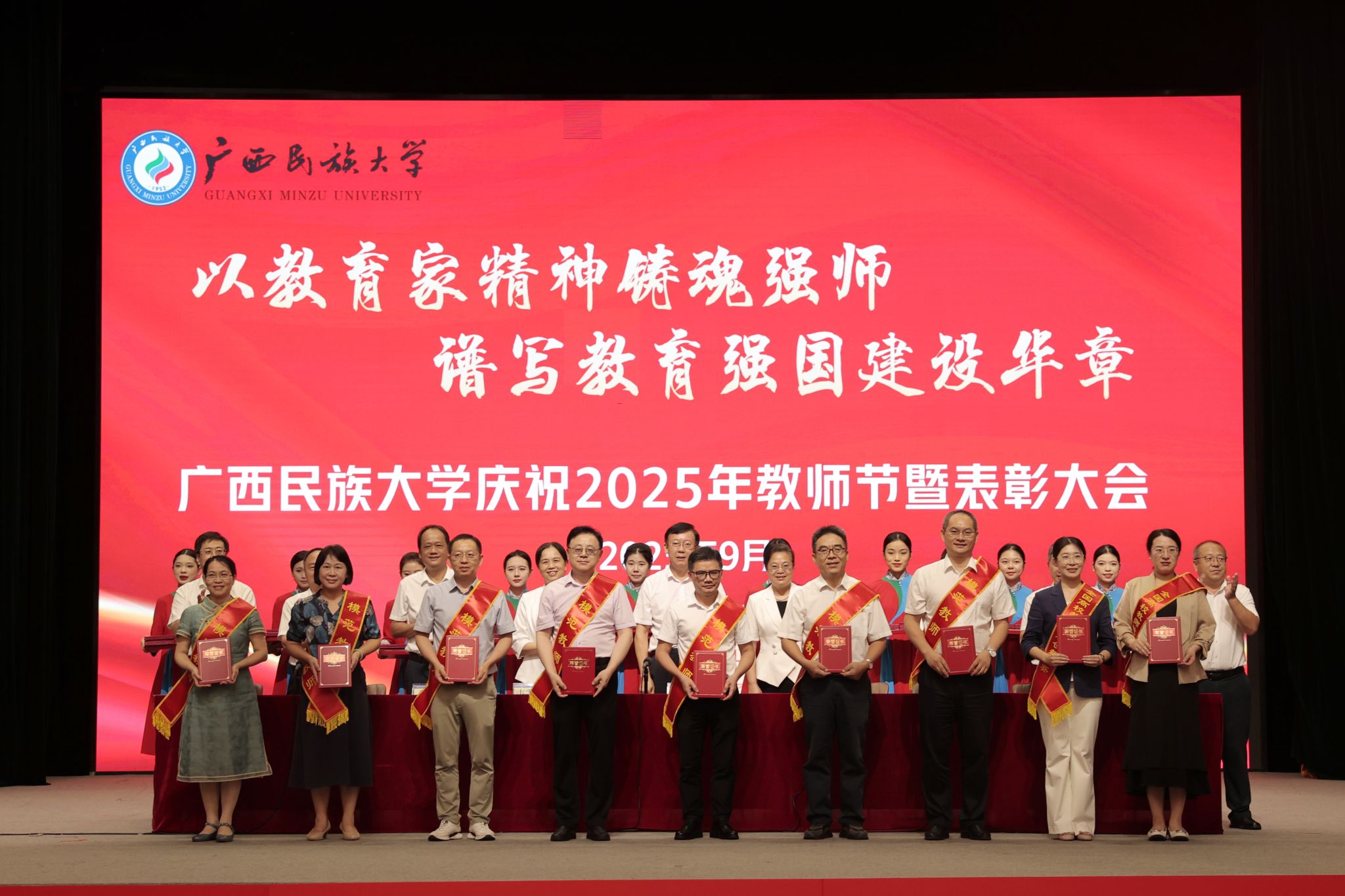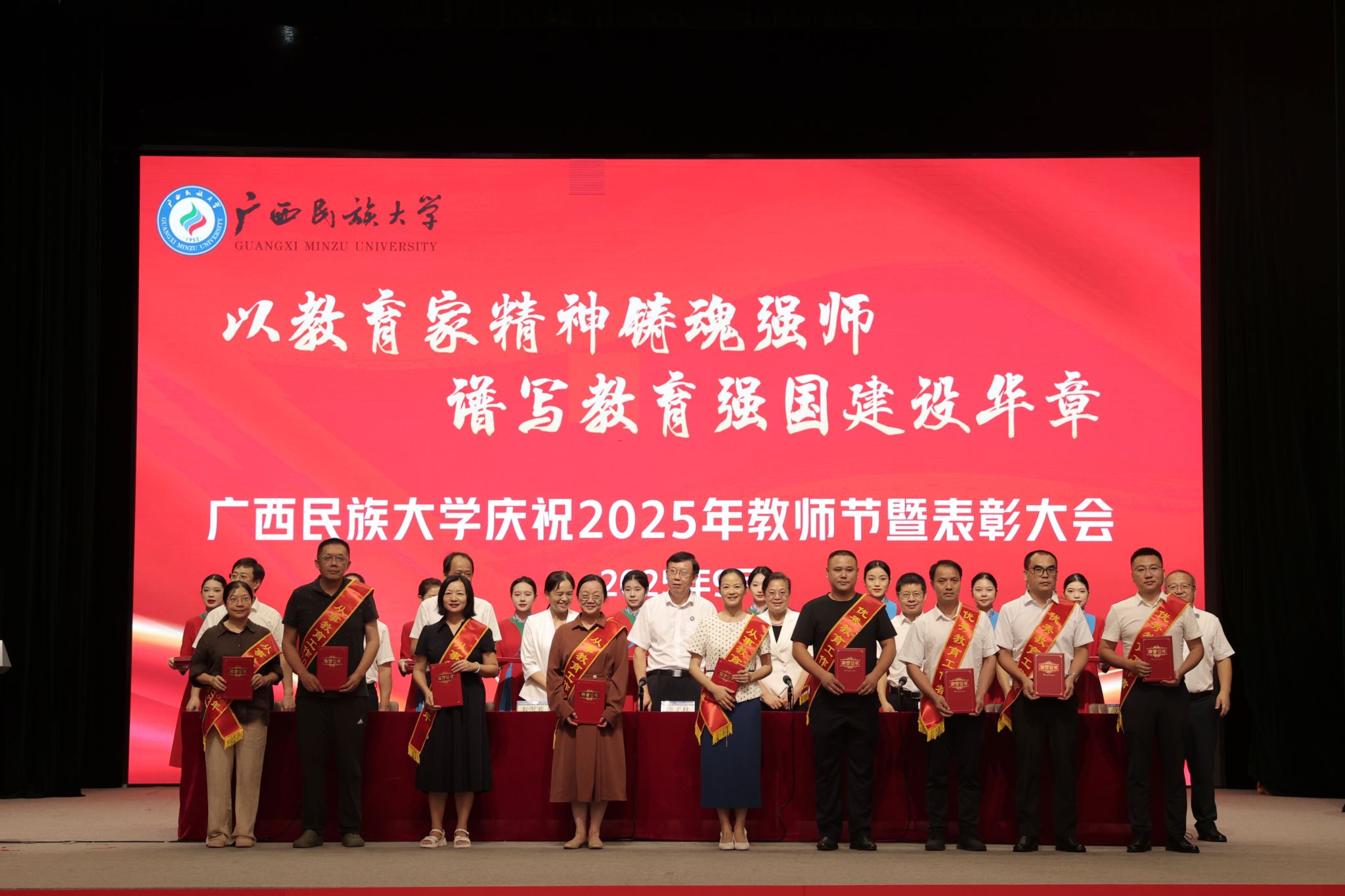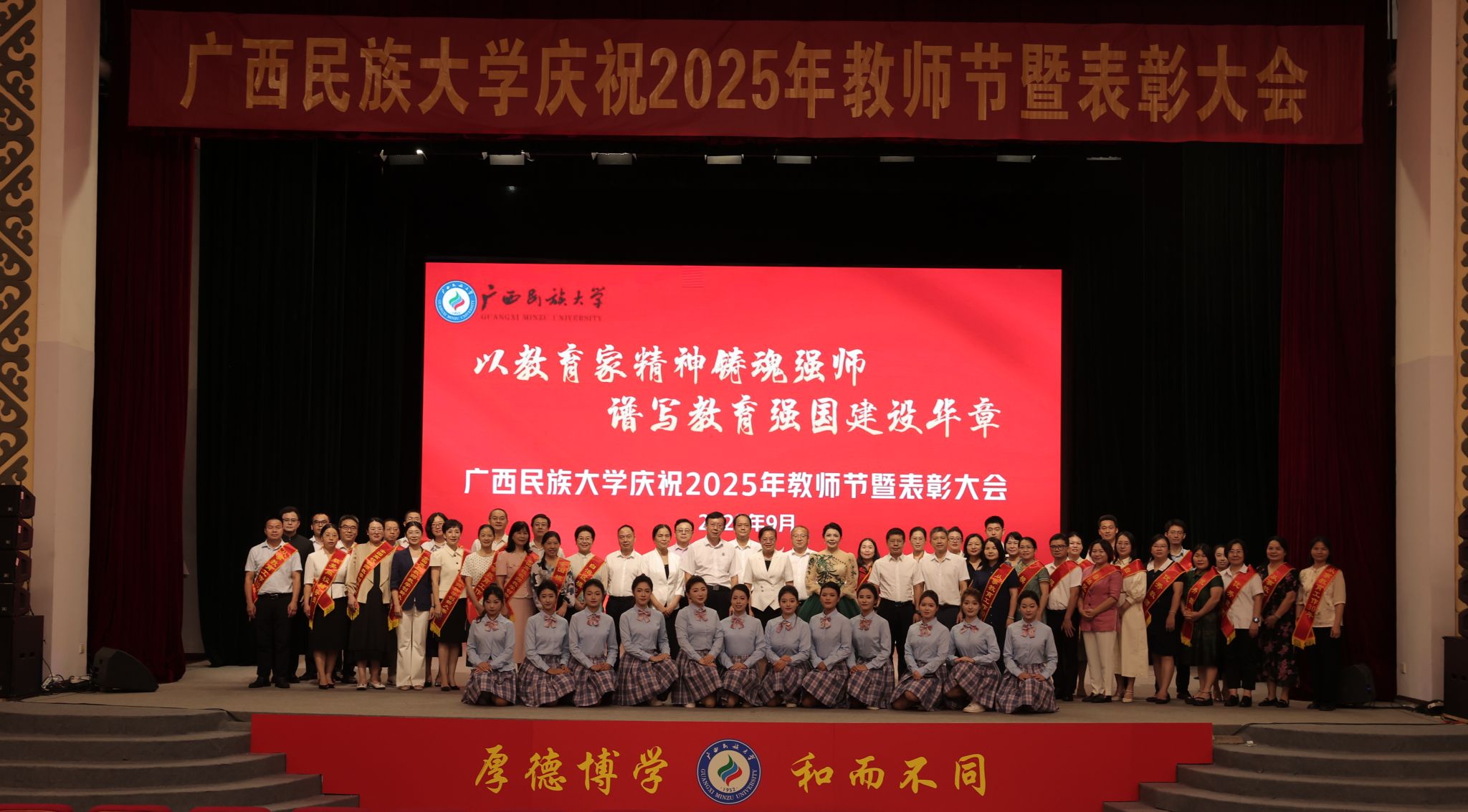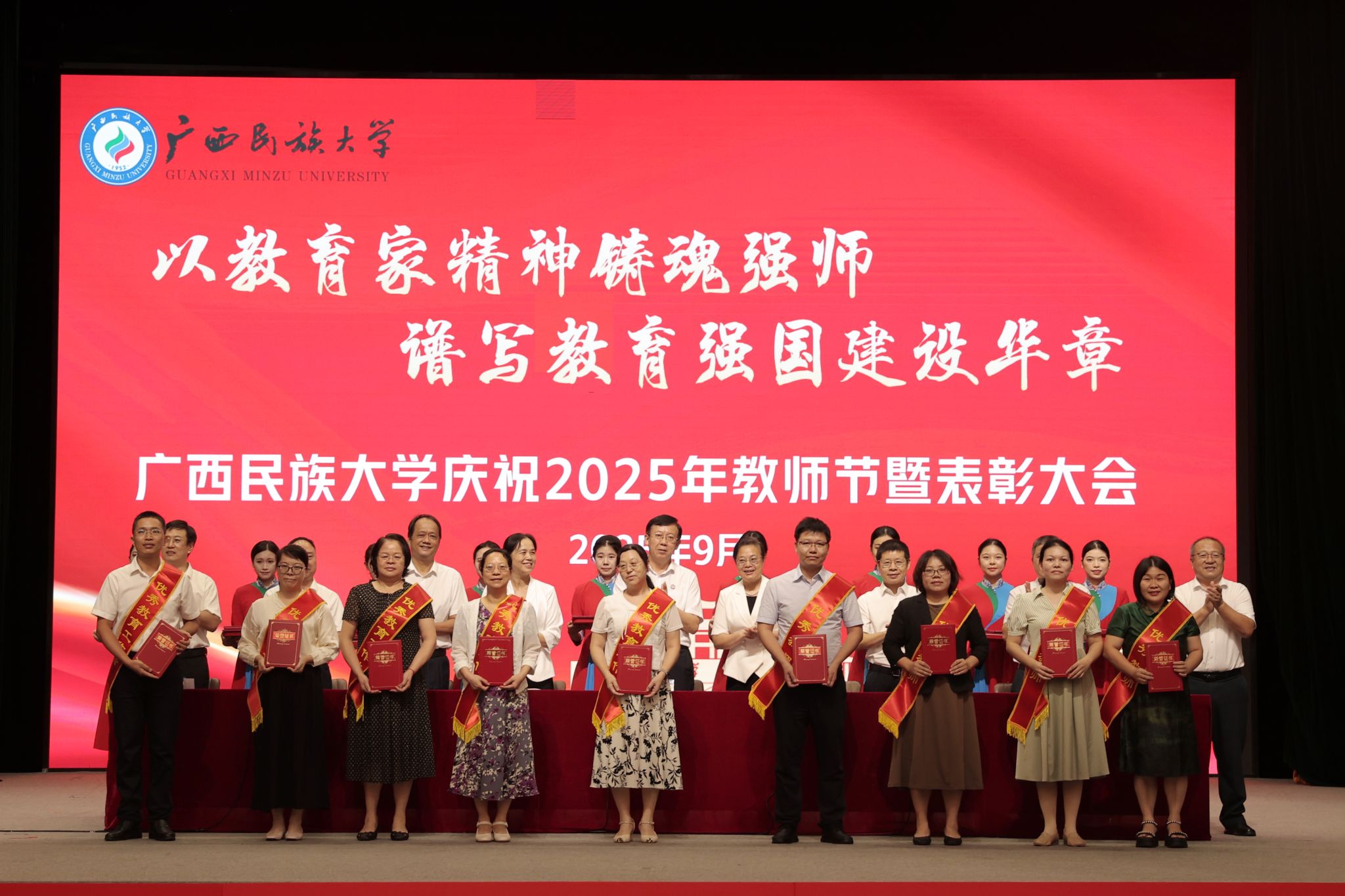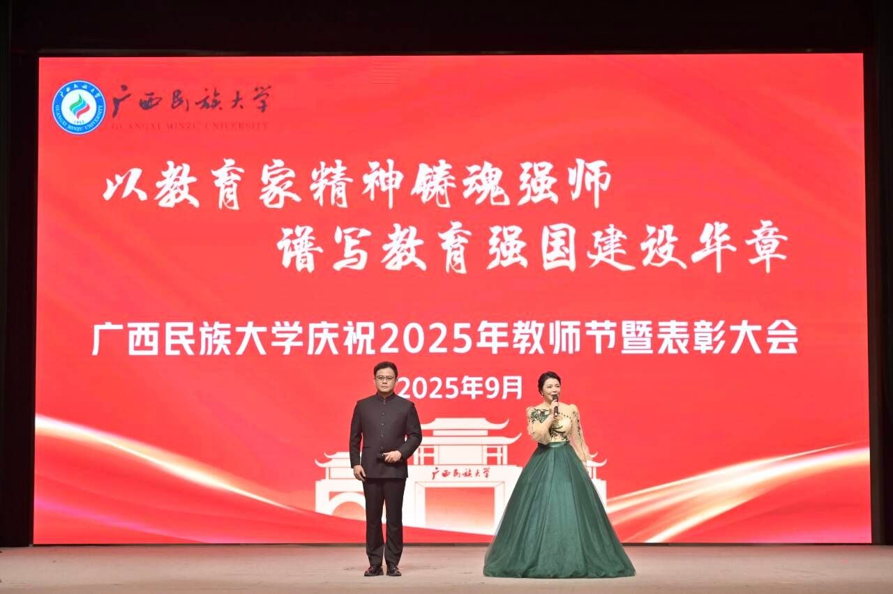 【大学生通讯社报道】9月9日下午,广西民族大学庆祝2025年教师节暨表彰大会在相思湖校区大礼堂召开。校党委书记唐平秋,校长韦仕珍,校领导韦雪芳、邓国彬、蔡高根、吕俊彪、何立荣、姜明国、高兴宇出席大会,教职工及学生代表参会。副校长何立荣主持大会。