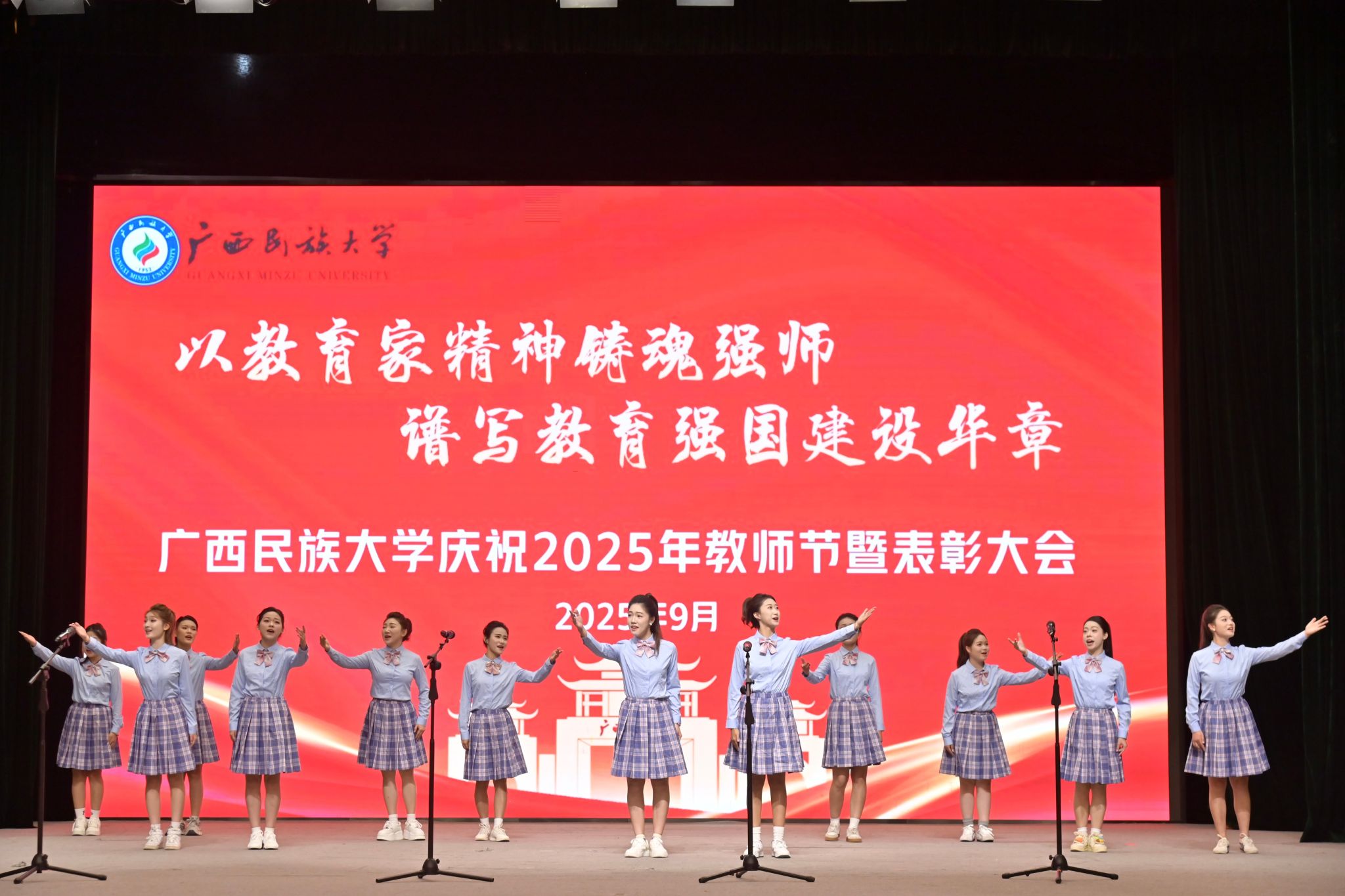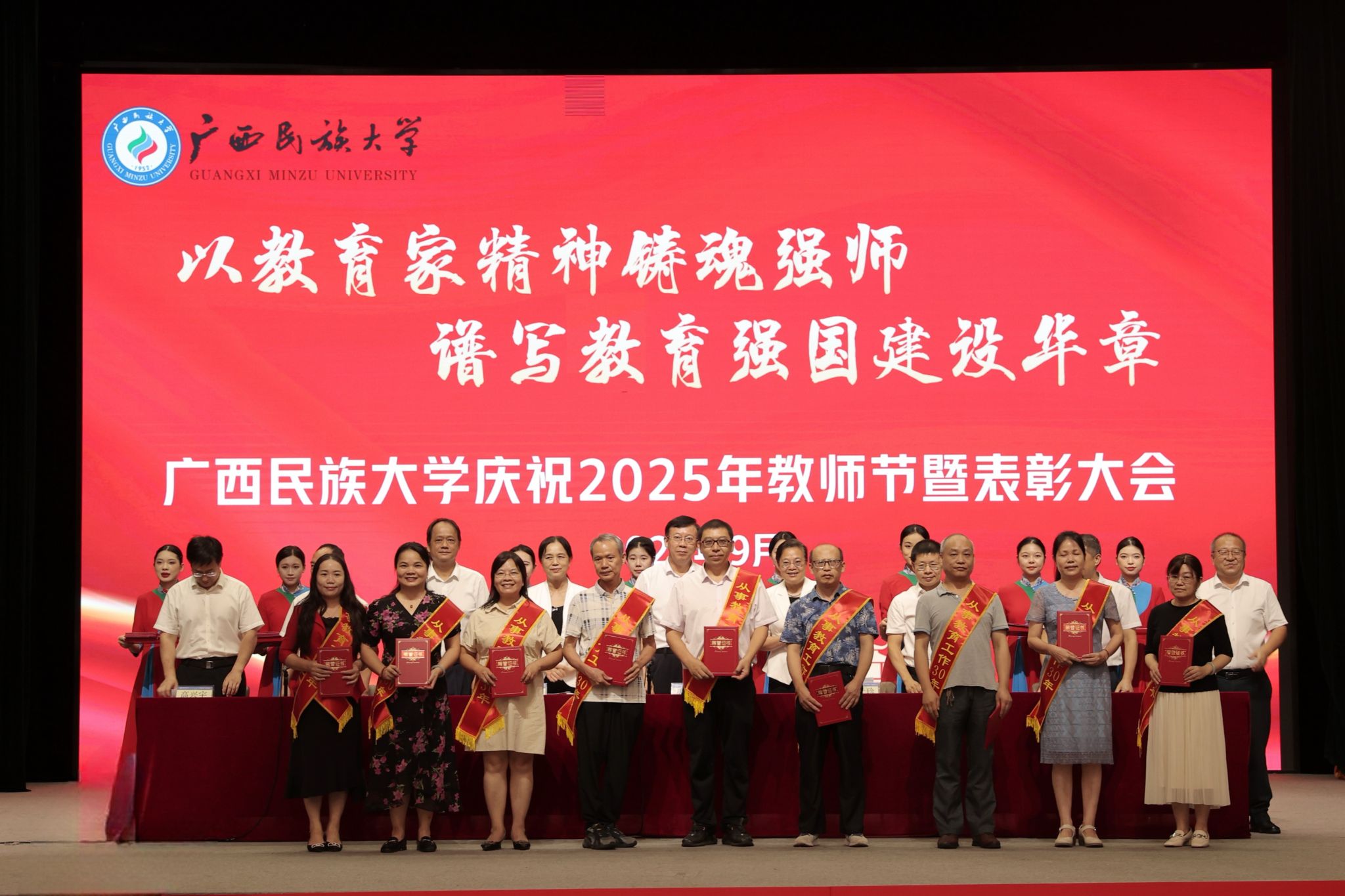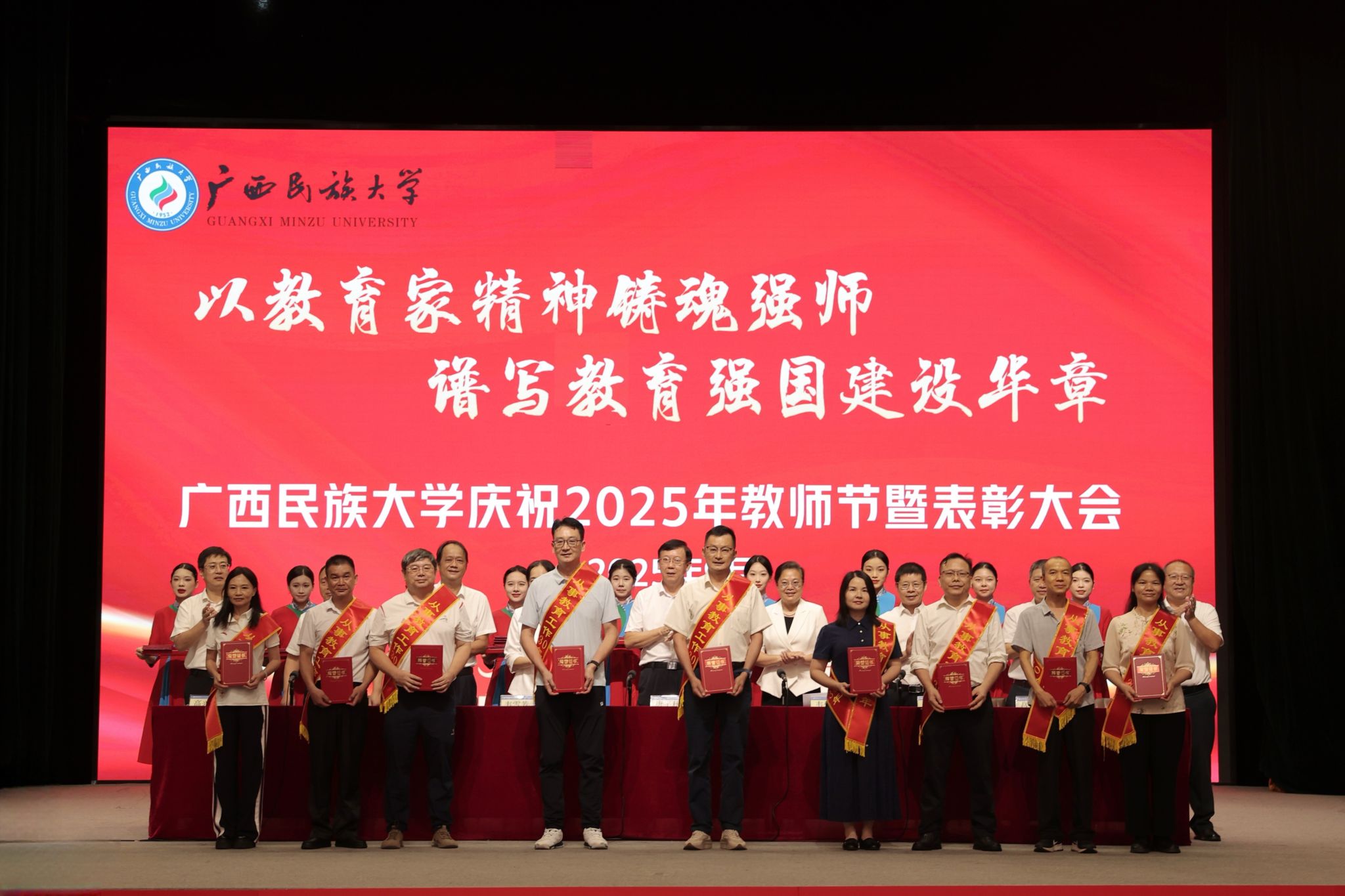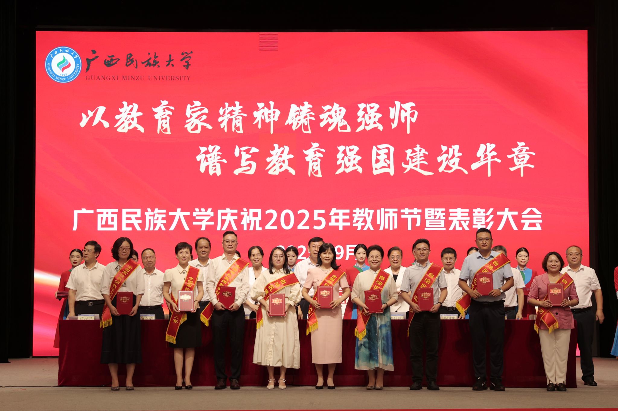 【大学生通讯社报道】9月9日下午,广西民族大学庆祝2025年教师节暨表彰大会在相思湖校区大礼堂召开。校党委书记唐平秋,校长韦仕珍,校领导韦雪芳、邓国彬、蔡高根、吕俊彪、何立荣、姜明国、高兴宇出席大会,教职工及学生代表参会。副校长何立荣主持大会。