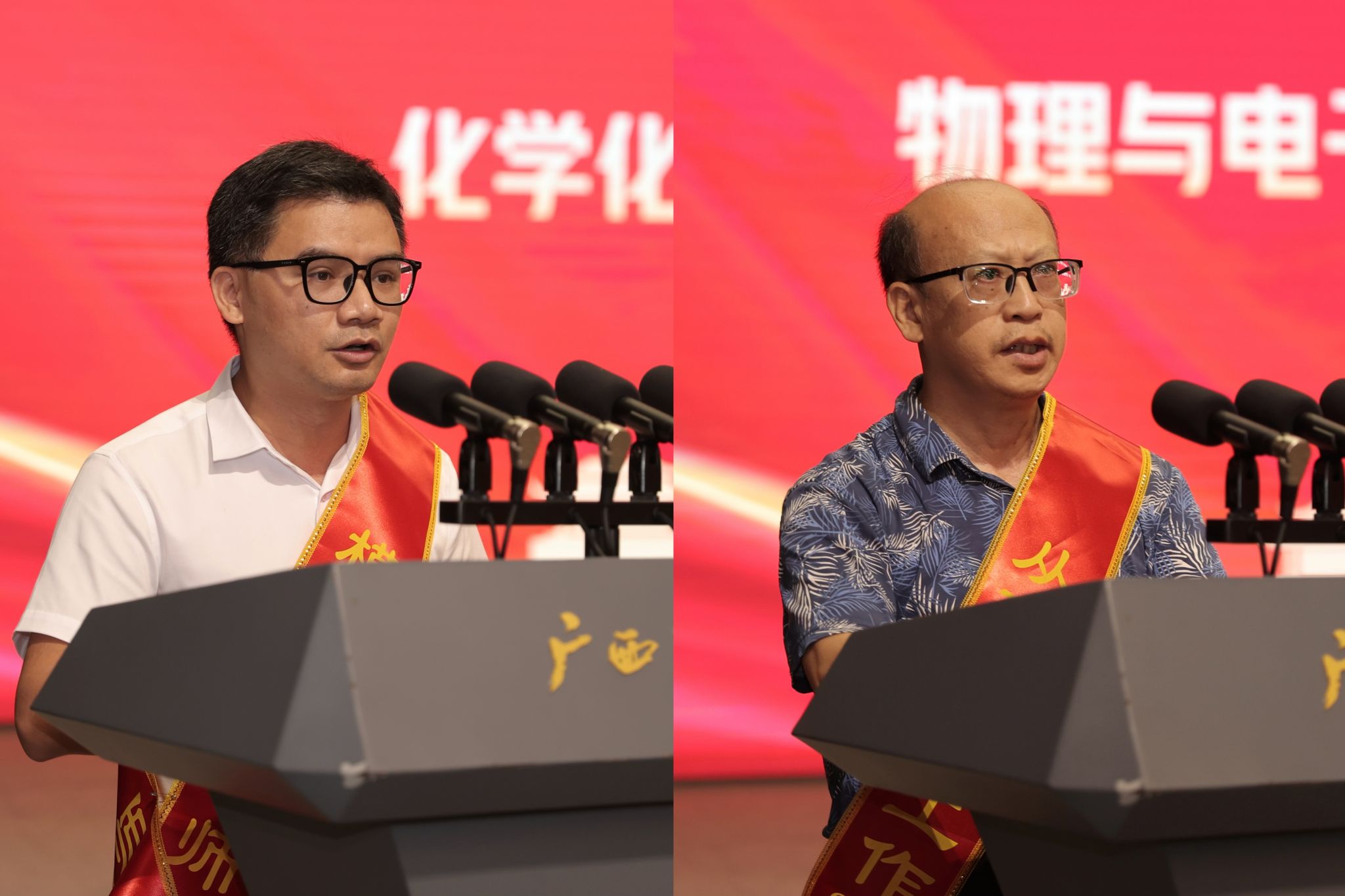 模范教师代表、化学化工学院关一富教授和“从事教育工作30年”教师代表,物理与电子信息学院何良明教授发言