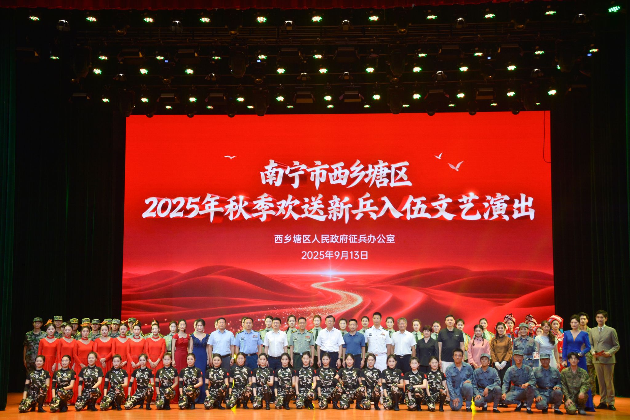 【大学生通讯社报道】9月13日下午,“青春赴军营,壮志护家国”——西乡塘区2025年秋季欢送新兵入伍文艺演出在广西民族大学思源湖校区大学生活动中心举行。南宁市委常委、南宁警备区大校政治委员尤易武,广西民族大学党委书记唐平秋,西乡塘区委副书记杨伍,西乡塘区人民武装部上校部长韩龙海,西乡塘区人民武装部上校政委伍文政等领导出席活动,广西各高校入伍新兵及其家属朋友共同观看了演出。