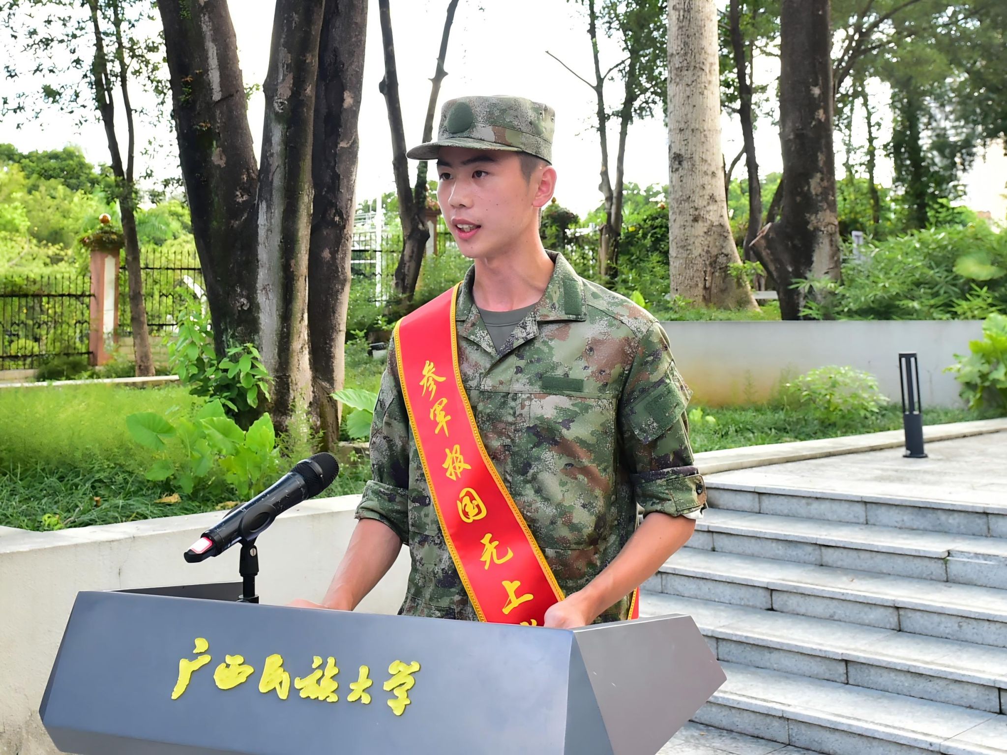 传媒学院2021级播音与主持艺术专业姚铭作为入伍学生代表发言:“我将永葆初心,牢记使命,以顽强意志投身军营训练,用青春热血守护祖国山河,用实际行动践行军人职责,为国防事业贡献青春力量。”(初审:钟华 复审:李建瑾 终审:孙寿媚)