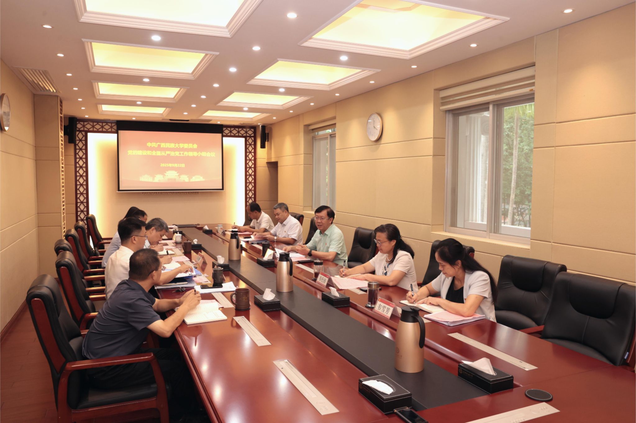 9月22日下午,广西民族大学召开党的建设和全面从严治党工作领导小组会议,传达学习习近平总书记关于学习教育的重要指示精神,学习贯彻中央和自治区党委党的建设工作领导小组会议精神,系统总结学校深入贯彻中央八项规定精神学习教育开展情况,研究部署巩固拓展学习教育成果、锲而不舍落实中央八项规定精神、推进作风建设常态化长效化工作。校党委书记唐平秋主持会议,党委副书记、校长韦仕珍出席会议,领导小组全体成员参加会议。