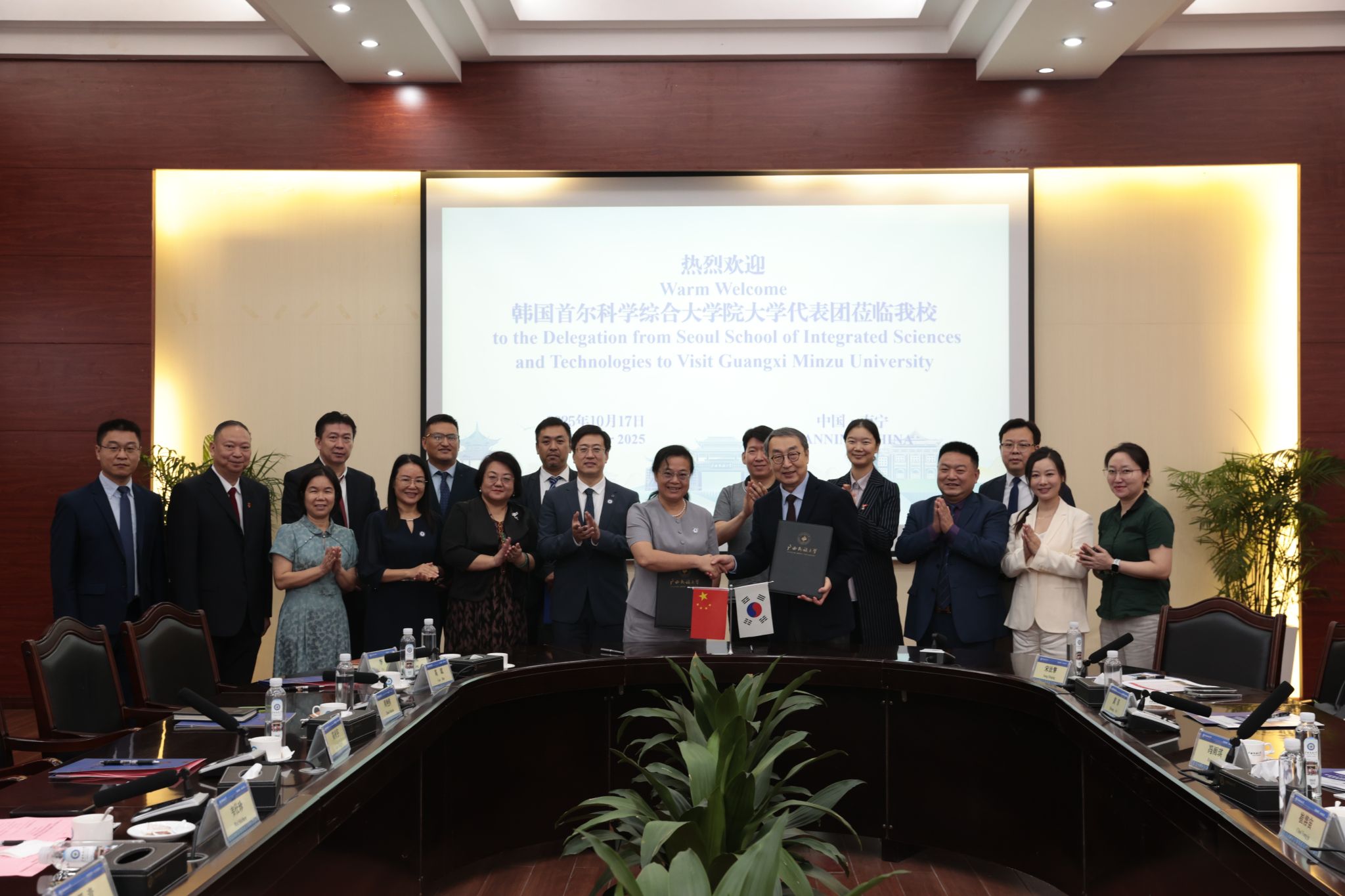 【大学生通讯社报道】10月17日上午,广西民族大学校长韦仕珍会见来访的韩国首尔科学综合大学院大学校长崔溶宙一行,双方在国际合作与交流处大会议室召开座谈会,副校长高兴宇主持。研究生院、国际合作与交流处、经济学院、教育科学学院、体育与健康科学学院、人工智能学院、艺术学院(民歌学院)负责人参加。
