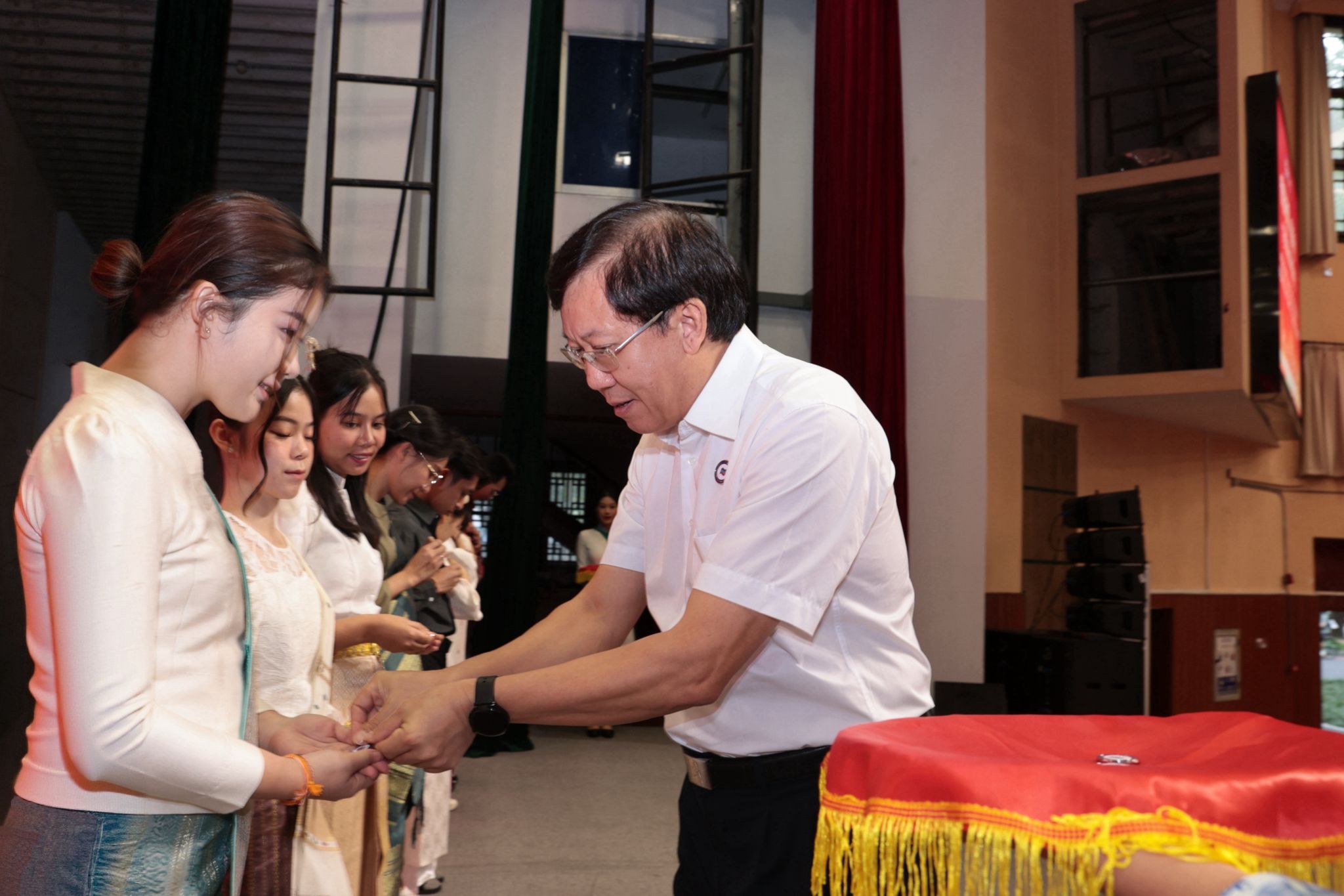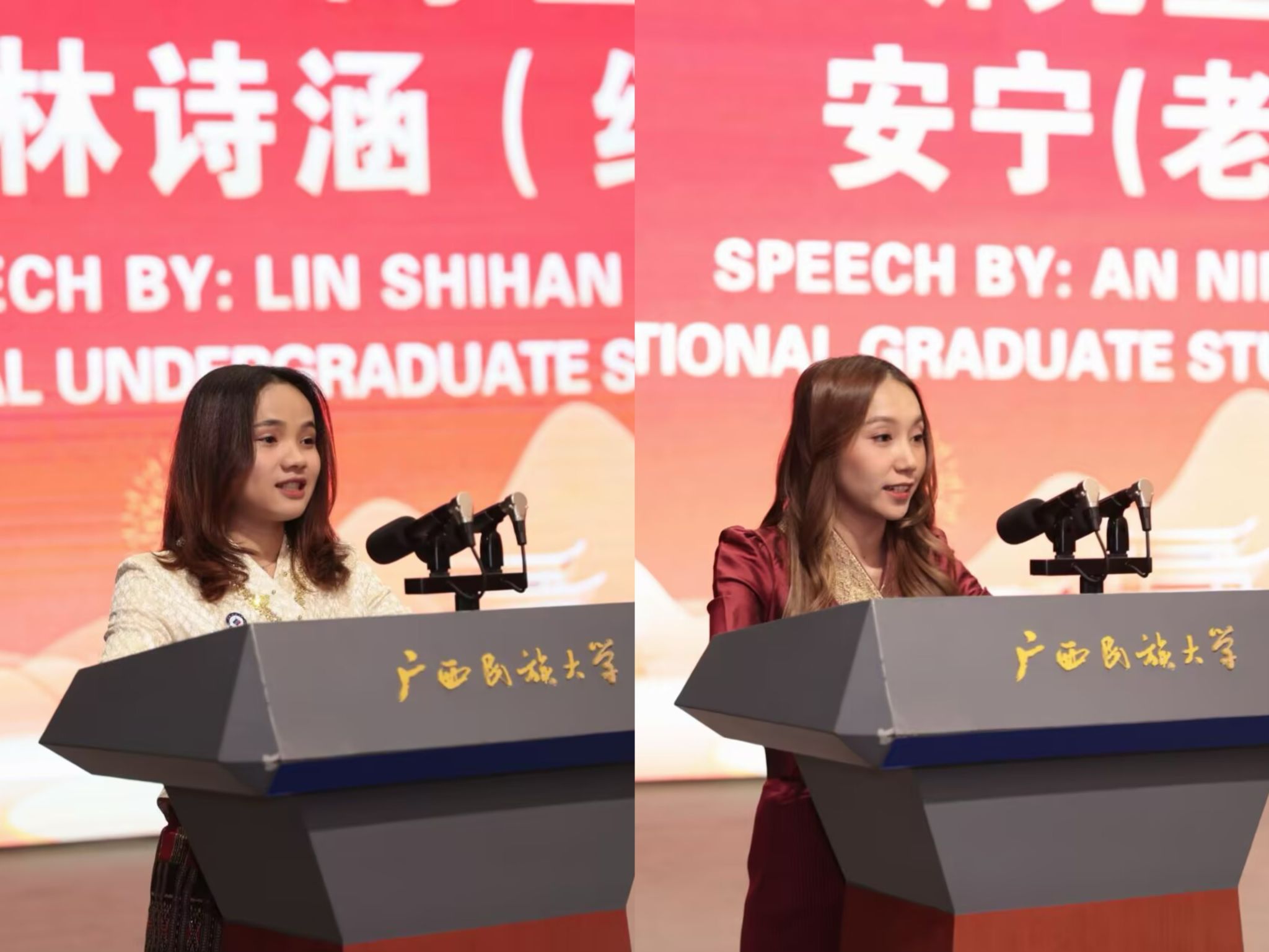 国际教育学院2023级汉语国际专业缅甸籍本科生林诗涵、文学院2023级国际中文教育专业老挝籍硕士研究生安宁作为在校生代表,分别从个人成长经历、学术成果以及校园生活感受等方面进行发言。她们表示,留学生活是独立生活与个人成长的重要阶段,希望新生们勇于克服困难,积极投身实践,在团结协作中增长才干与本领。