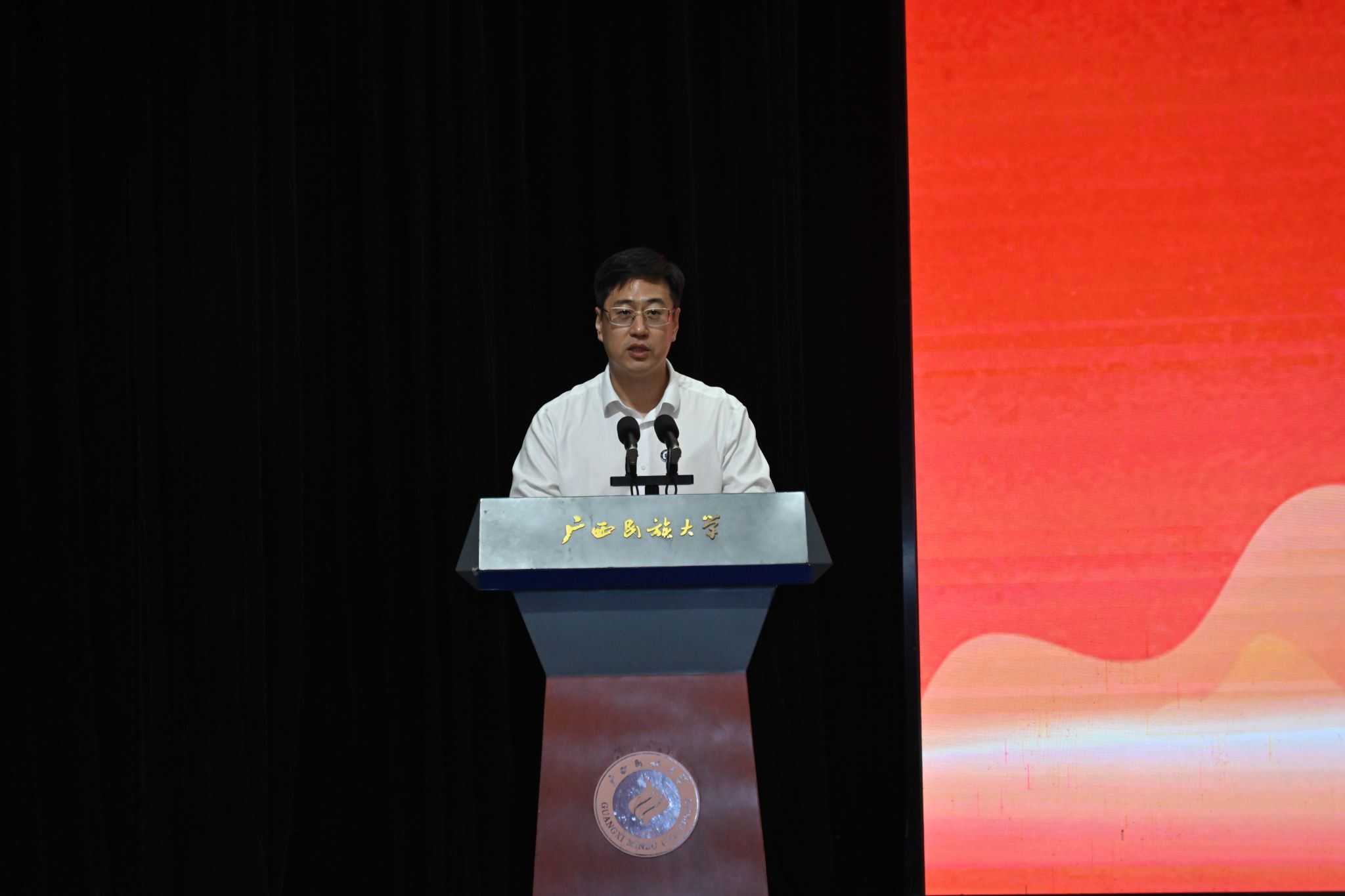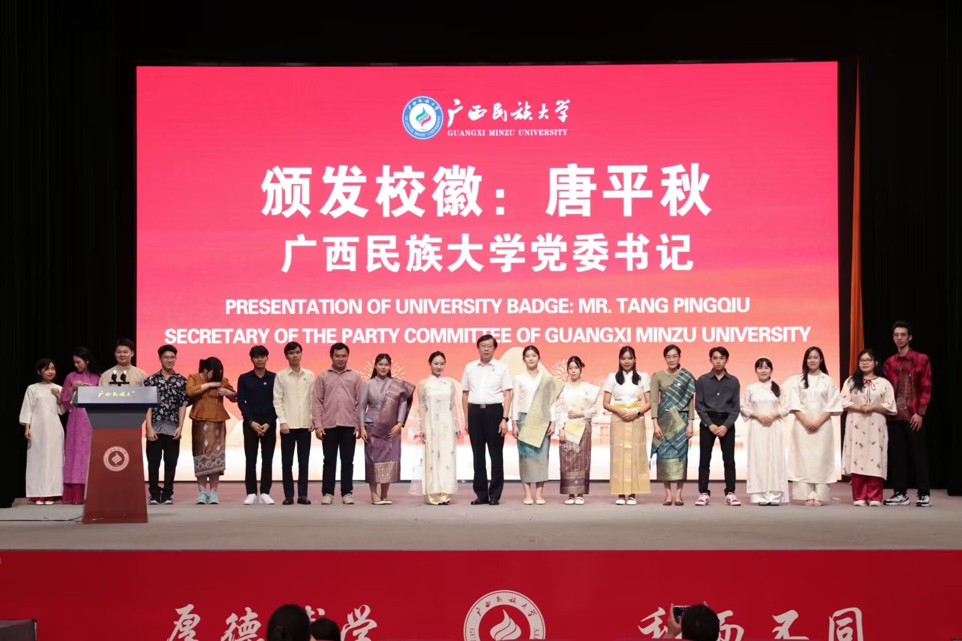 【大学生通讯社报道】10月21日下午,广西民族大学2025年来华留学生开学典礼在相思湖校区大礼堂举行。校党委书记唐平秋出席并为留学生代表颁发校徽,校长韦仕珍出席并讲话。副校长高兴宇主持典礼,学校有关职能部门及留学生培养学院负责人、2025级全体留学生参加典礼。