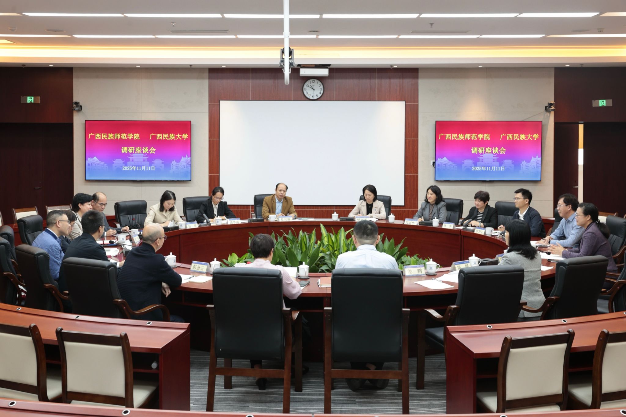 【大学生通讯社报道】11月11日上午,广西民族师范学院党委书记曹迎,党委副书记、校长马宁一行到广西民族大学调研,广西民族大学党委书记唐平秋,党委副书记、校长韦仕珍陪同调研,双方在文化研习基地召开调研座谈会。
