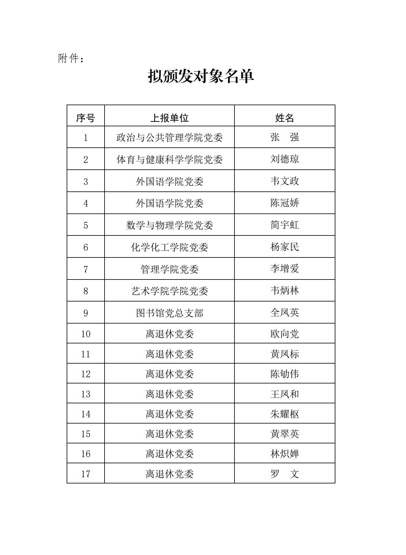 根据《自治区党委教育工委关于做好2024年“光荣在党50年”纪念章颁发工作的通知》(桂教工委组〔2024〕12号)要求,学校于2024年4月对截至2024年7月1日(含)党龄达到50周年的党员进行了统计(已颁发过纪念章的不统计在内),现将符合条件的党员名单进行公示,公示时间为2024年5月7日至5月11日。