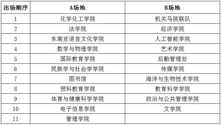 14:50参赛队入场(按照A、B场抽签顺序面对主席台从右至左列队,A场队伍在A场列队、B场队伍在B场列队);