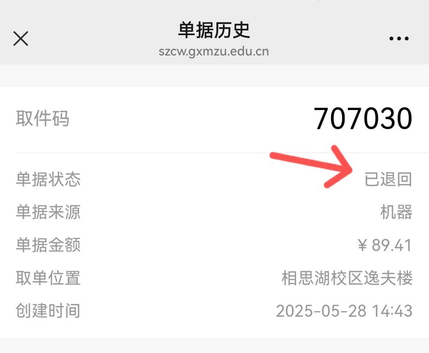 3.经审核材料有问题的,财务处工作人员将在数智财务系统中注明退单原因,原则上单据退回至原投递校区的退单柜中,退单材料补充完整后请重新投递。
