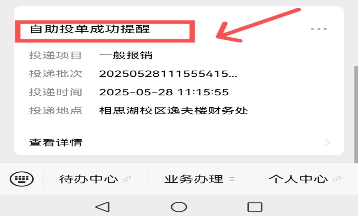 投单成功后,“广西民族大学数智财务”微信公众号会推送自助投单成功提醒到报销申请人。