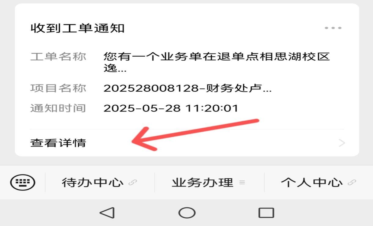 4.如发生退单,相关信息将通过微信公众号信息推送形式通知报销申请人。点击“查看详情”进入后,即可查看具体退单地点和取件码。