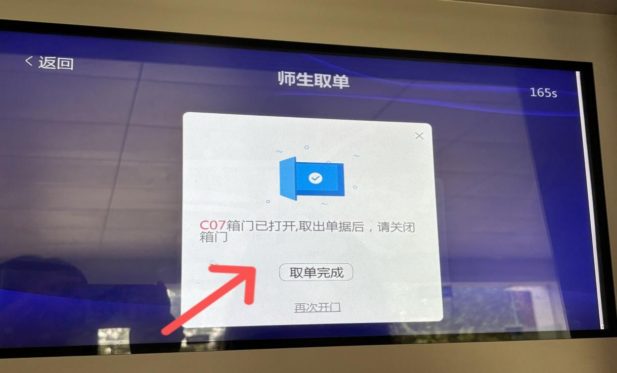 第三步:按页面提示的信息,取出退单材料,关闭箱门。
