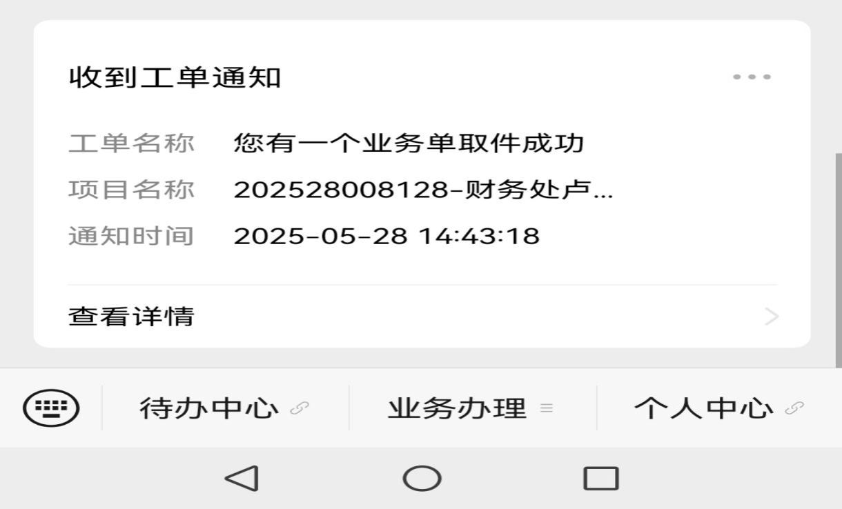 取退单件成功后,“广西民族大学数智财务”微信公众号会推送取件成功提醒到报销申请人。如有需要可点击“查看详情”即可查看单据状态。