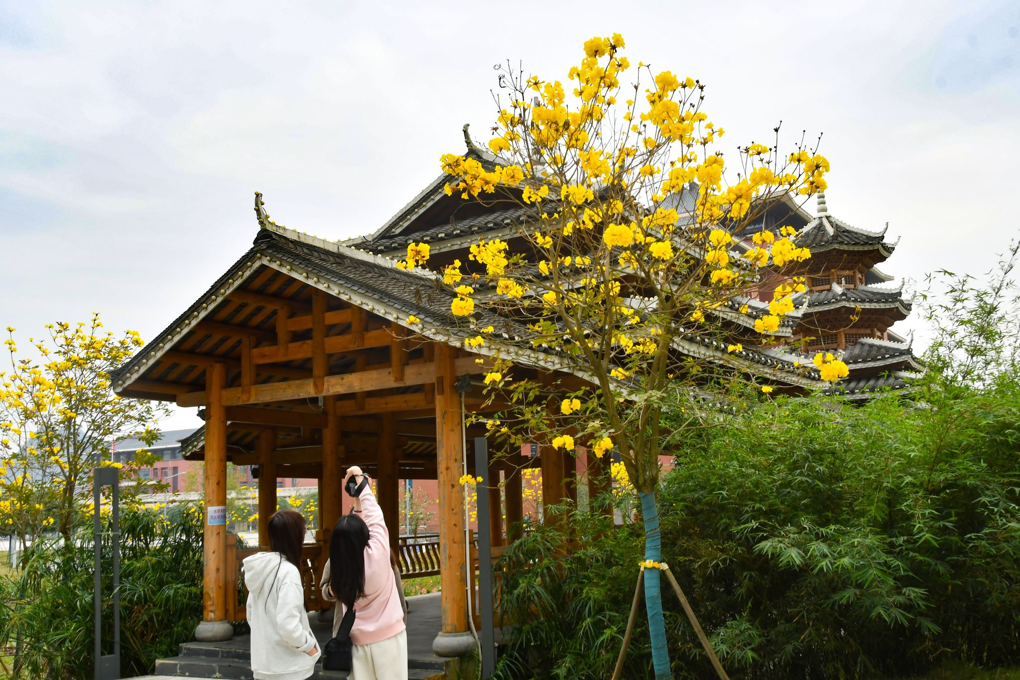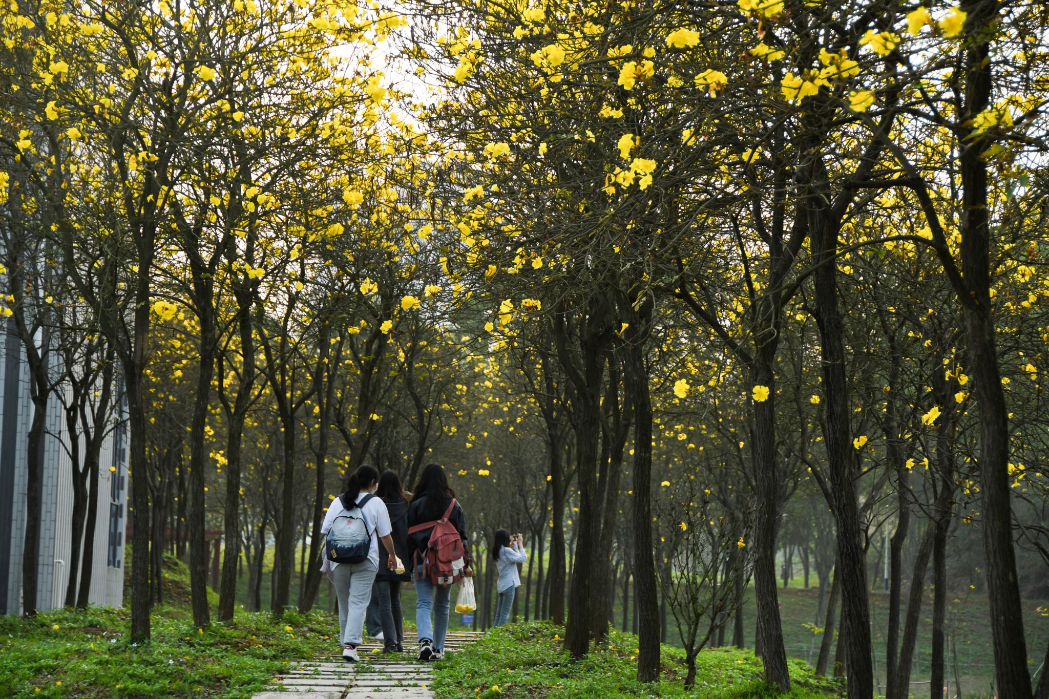 【大学生通讯社报道】桃花嫣红笑春风,黄花风铃舞晴空。阳光斑驳映草坪,云影婆娑绘苍穹。
