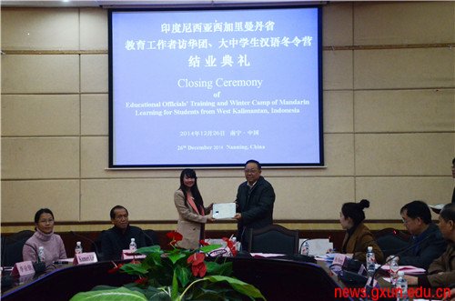 【大学生通讯社报道】12月26日下午,印度尼西亚西加里曼丹省教育工作者访华团和大中学生汉语冬令营结业典礼在我校国际交流处会议室举行。我校副校长贺争平为各位成员颁发结业证书,希望他们今后能够常来民大交流访问或留学深造,成为中国和印尼两国文化交流的友好使者。