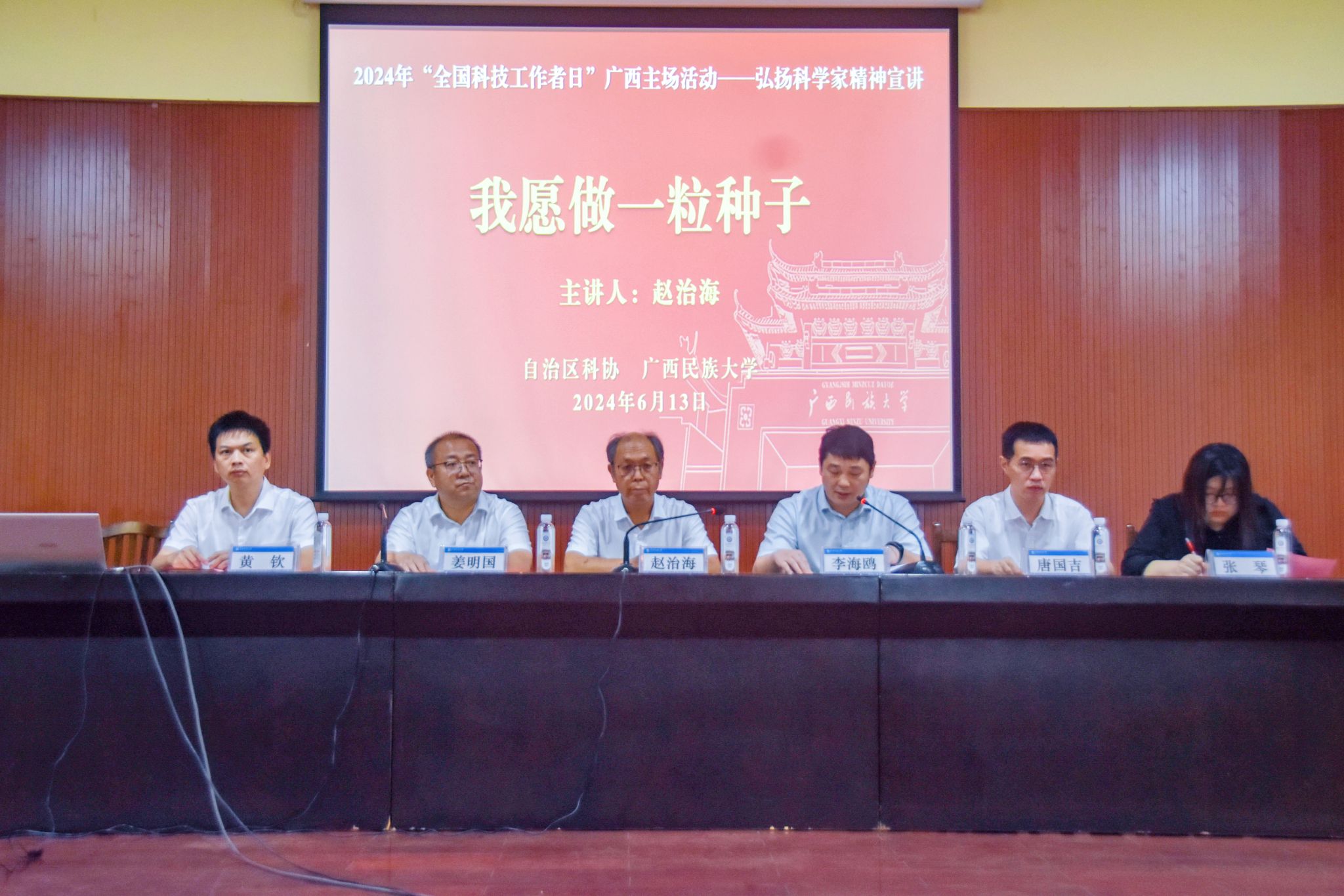 弘扬科学家精神宣讲活动在扬帆楼135报告厅举行。全国五一劳动奖章获得者、广西民族大学外聘专家教授赵治海以《我愿做一粒种子》为题作弘扬科学家精神主题报告。他结合自己40多年带领团队开展杂交谷子科研攻关的历程,讲述基层农业科技工作者的创新奋斗故事,分享自己的理念:平平淡淡,做好一粒谷种,杂交谷子让“中国饭碗”端得更牢。