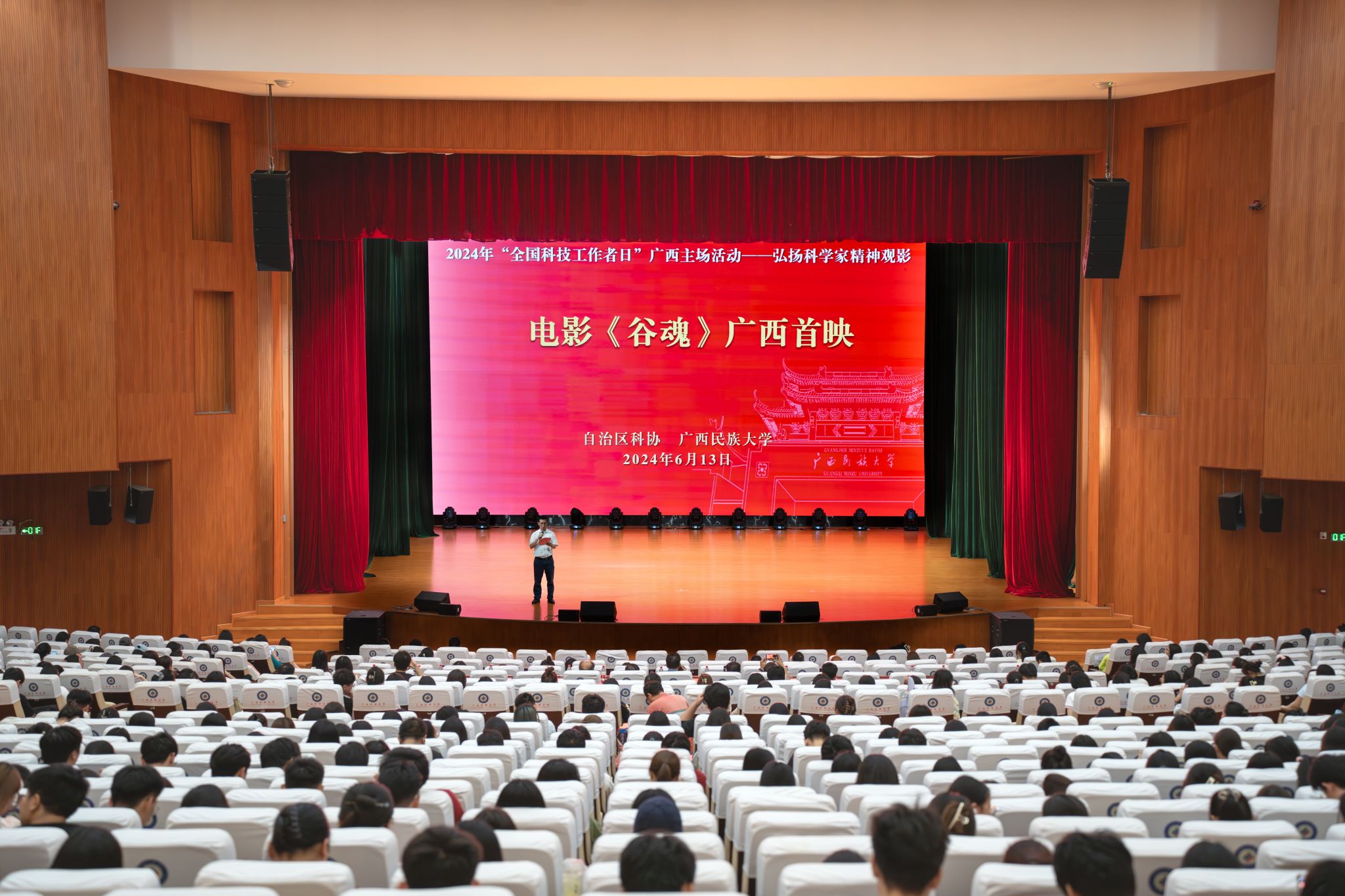 广西主场活动弘扬科学家精神主题观影暨《谷魂》广西首映仪式在思源湖校区大学生活动中心大礼堂举行。电影《谷魂》讲述“杂交谷子之父”赵治海带领团队历经几十年坚守“谷子杂交”科研事业,最终攻破“杂交谷子”世界技术的科研难题,创造“张杂谷”亩产811.9公斤的高产世界纪录,是我国继杂交水稻之后对世界粮食安全的又一重大贡献,塑造了新时代农业科学家形象。