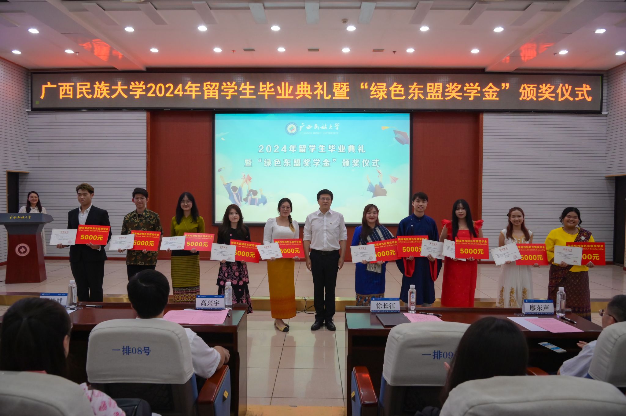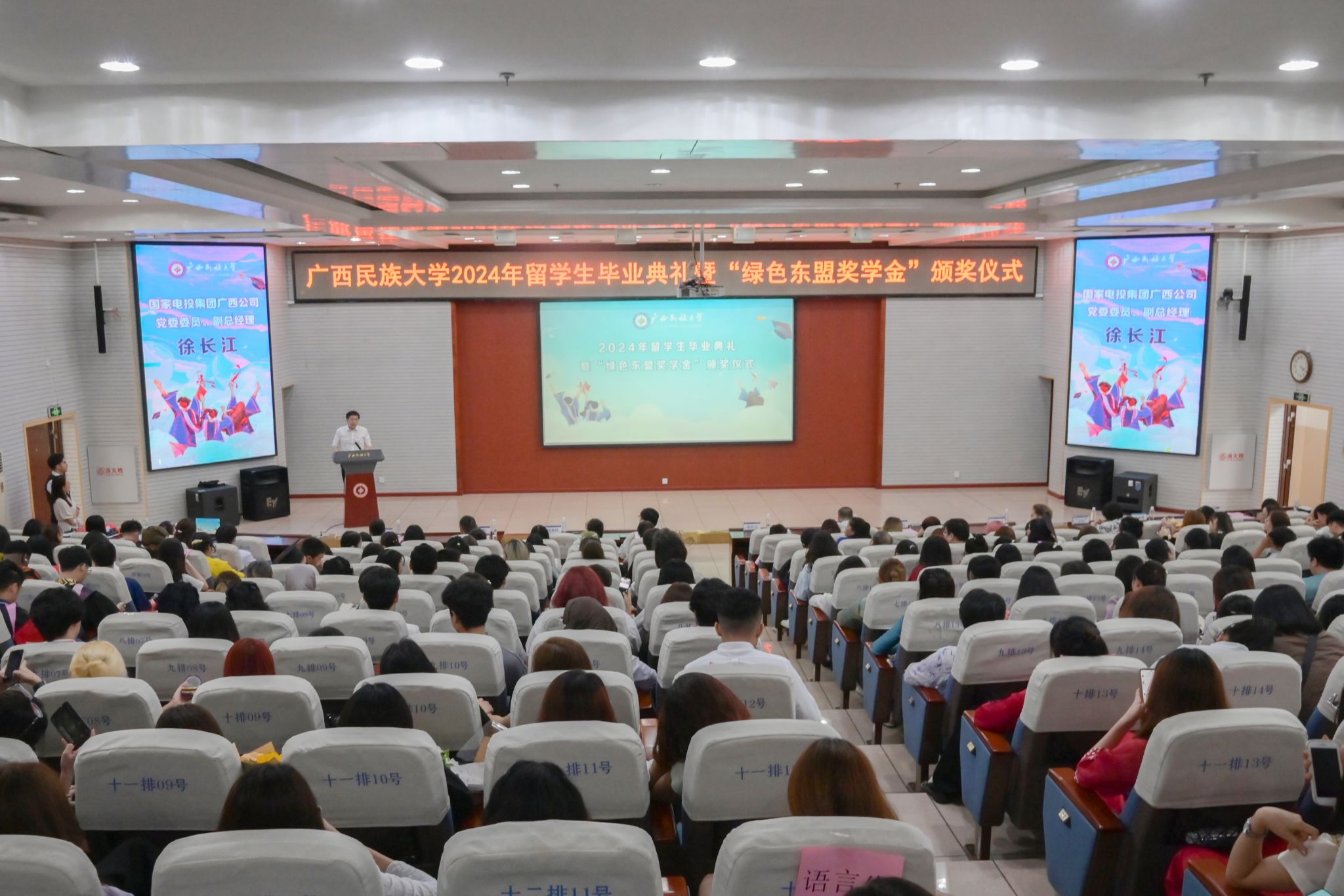 【大学生通讯社报道】6月25日,广西民族大学举行2024年留学生毕业典礼暨“国家电投绿色东盟奖学金”颁奖仪式。副校长高兴宇,国家电力投资集团广西电力有限公司副总经理徐长江出席活动。学校有关职能部门负责人、各学院教师代表及200余名在校毕业、结业留学生与会。
