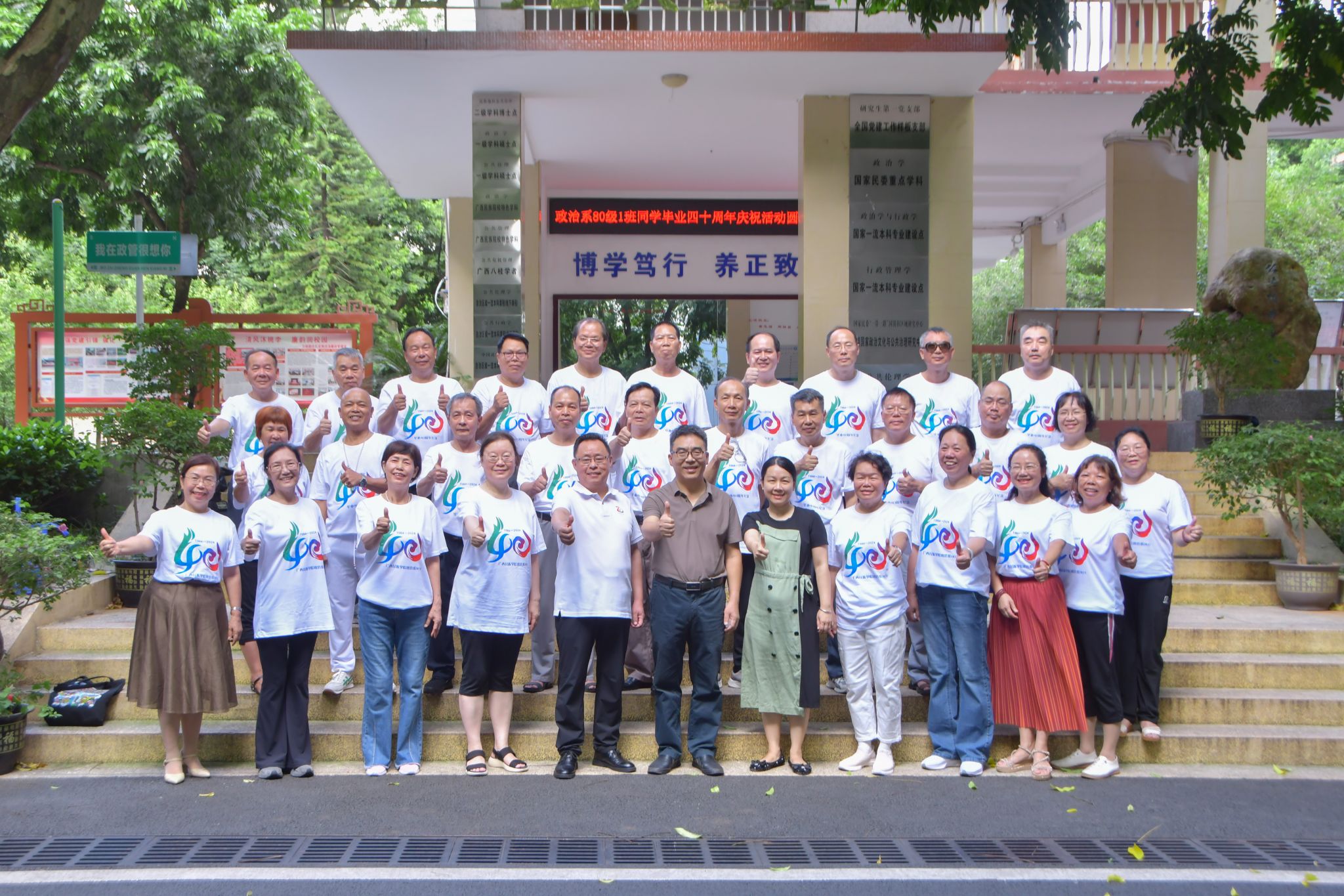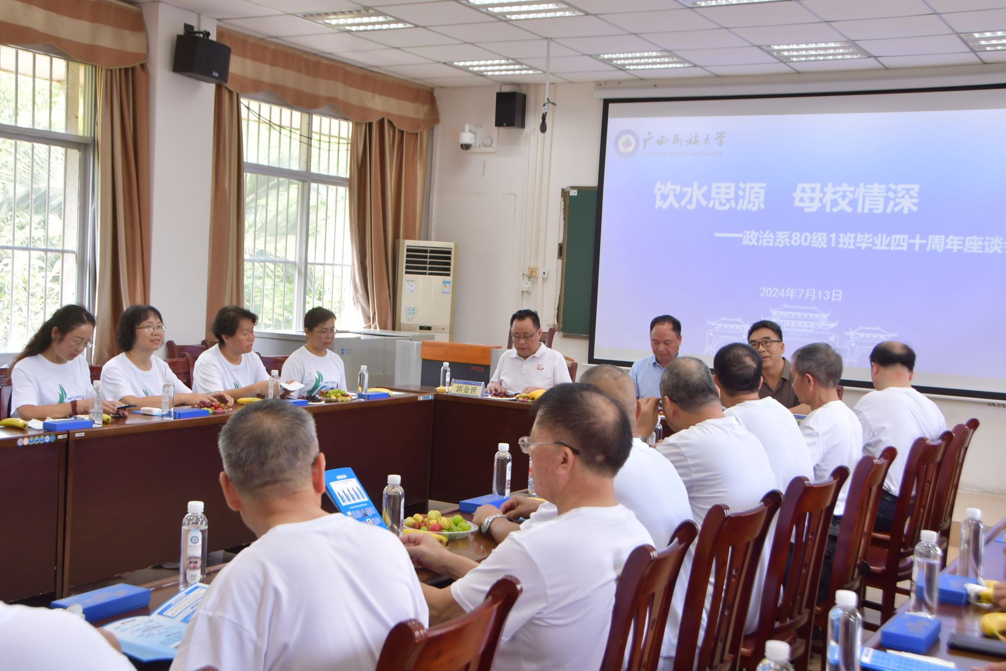 【大学生通讯社报道】7月13日上午,原广西民族学院政治系1980级1班校友毕业四十周年座谈会在博文楼401室举行。校党委常委、副校长何立荣,校友联络办公室主任郭金世参加座谈会。会议由政治与公共管理学院院长唐贤秋主持。