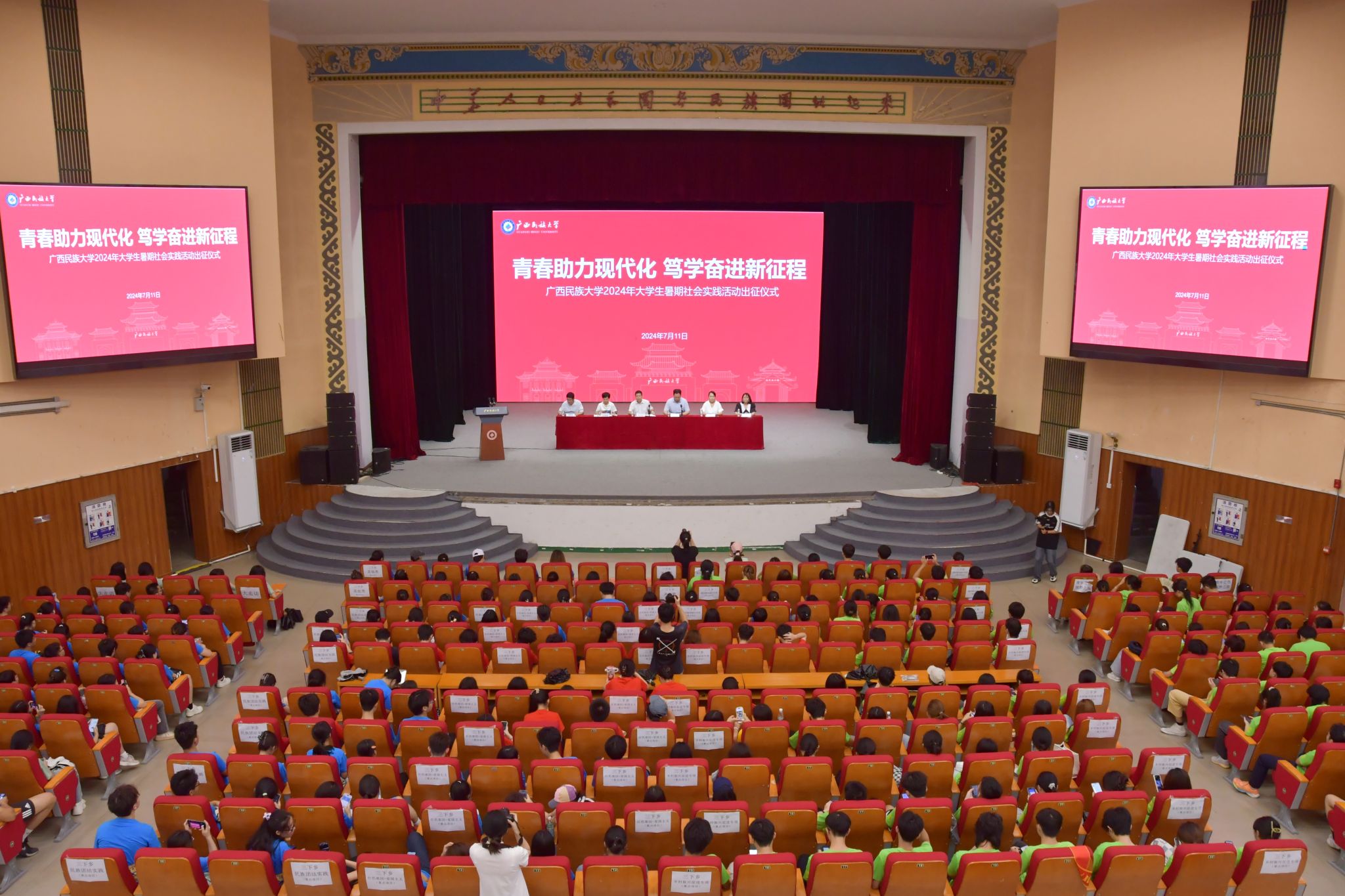 【大学生通讯社报道】7月11日,广西民族大学在相思湖校区礼堂举行2024年“青春助力现代化,笃学奋进新征程”大学生暑期社会实践活动出征仪式。学校党委副书记邓国彬,有关职能部门负责人及各类项目立项的相思湖校区、思源湖校区团队成员与立项个人参加仪式。