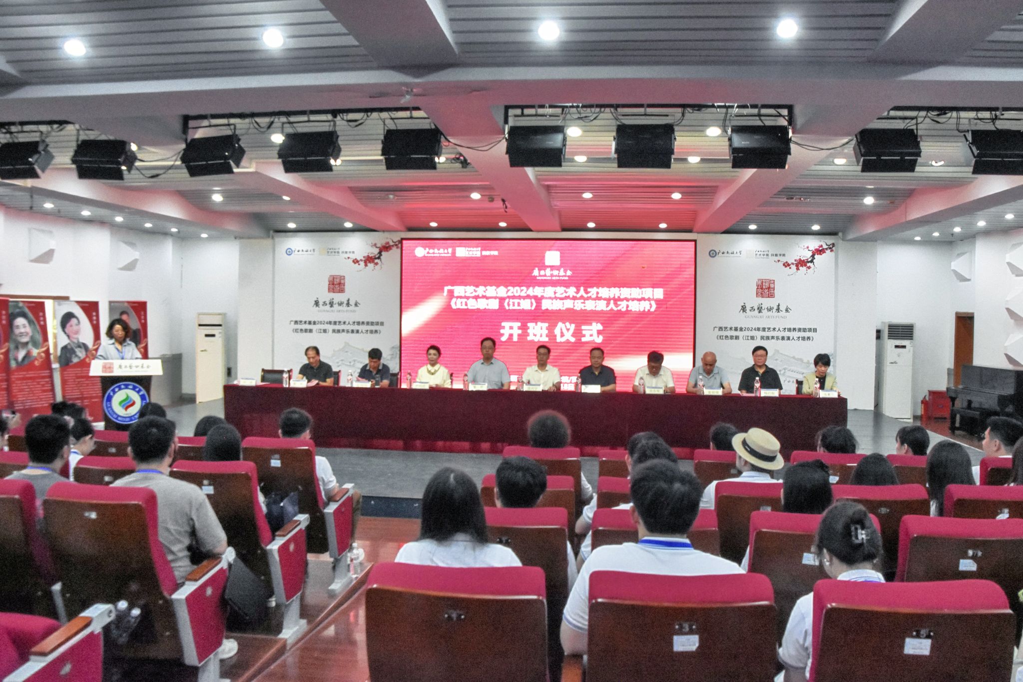 【大学生通讯社报道】9月18日下午,广西艺术基金2024年度艺术人才培养资助项目“红色歌剧《江姐》民族声乐表演人才培养”开班仪式在广西民族大学举行。广西民族大学党委常委、副校长高兴宇,广西艺术创作中心主任傅滔,广西艺术基金中期监督专家朱创伟、黄朝瑞、蔡央,著名词作家、一级编剧杨启舫出席开班仪式。