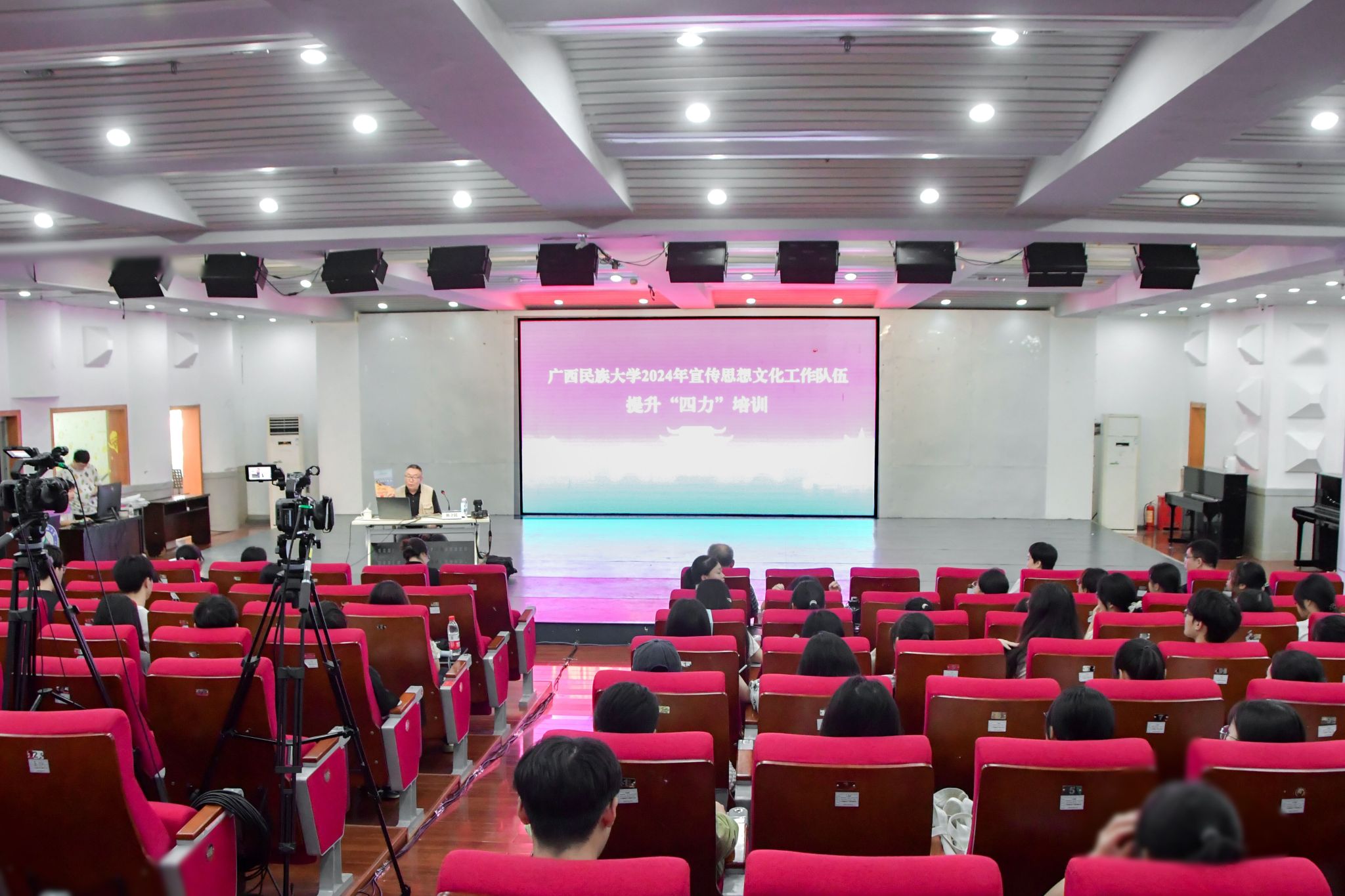 【大学生通讯社报道】10月19日,广西民族大学在相思湖校区大学生活动中心201室召开2024年宣传思想文化工作队伍提升“四力”培训班。民族画报社朝鲜文编辑部主任、主任记者陈立民作“用图片讲故事”主题培训,各学院负责新闻宣传工作师生代表,学校大学生通讯社、相思湖电台、新媒体工作室等社团参加,思源湖校区、武鸣校区线上参会。