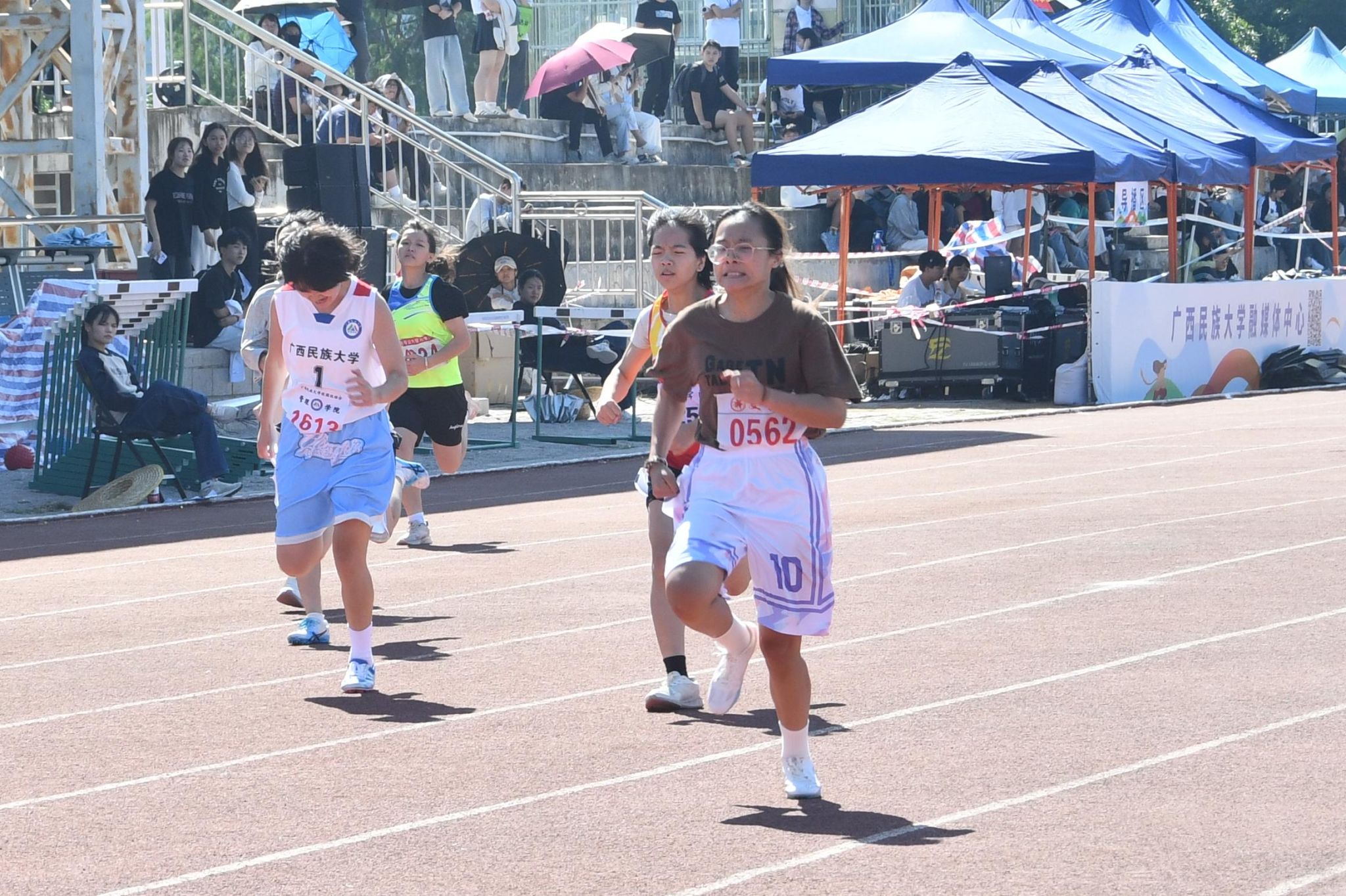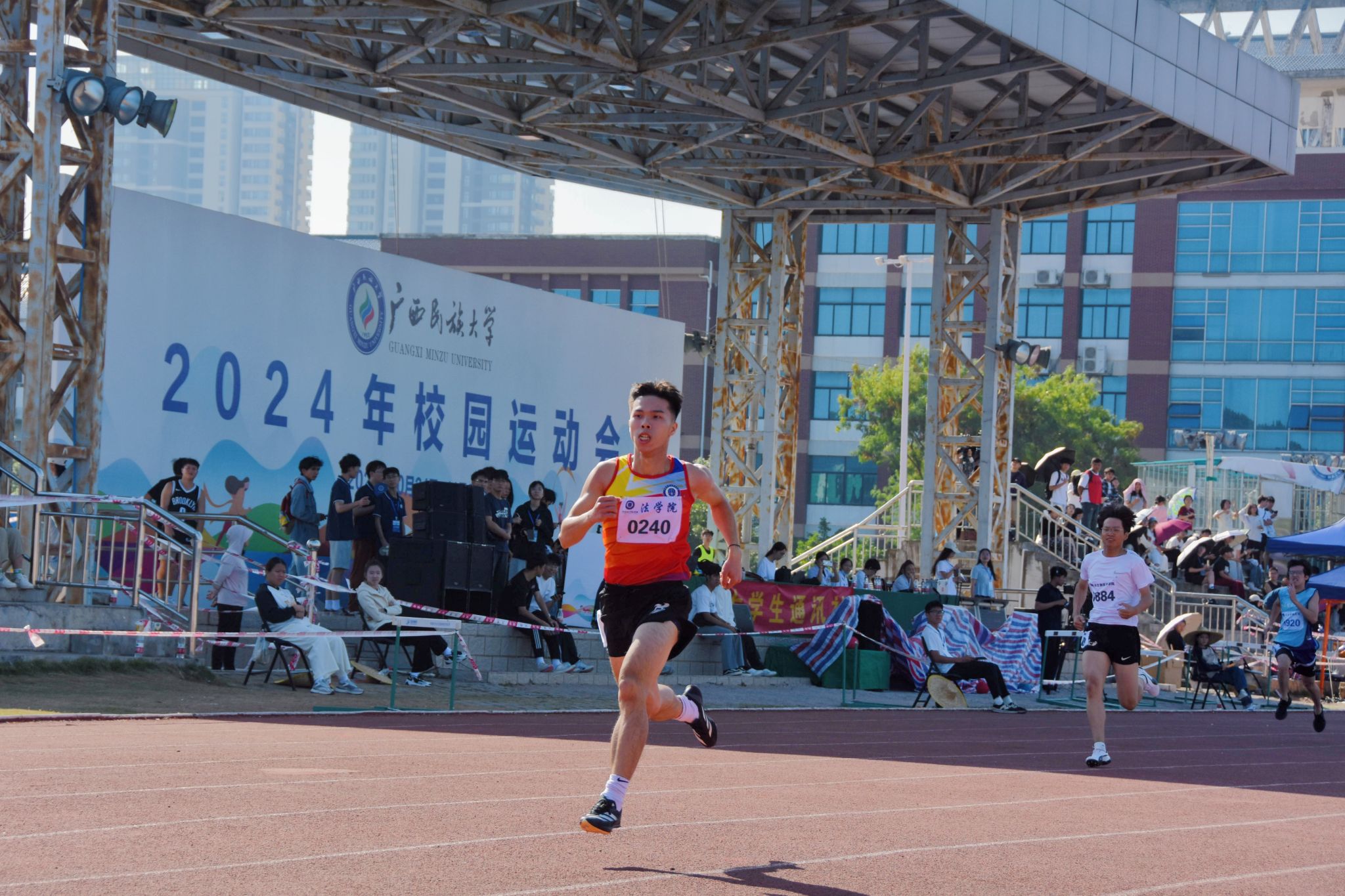 【大学生通讯社报道】11月1日11时10分,2024年广西民族大学运动会男、女子甲组200米比赛在思源湖校区李宁田径场火热开赛。法学院2023级法学专业覃琨洋、文学院2023级汉语言文学师范专业唐宝珠以24.74秒、30.83秒的成绩分别获得男、女子甲组200米冠军。
