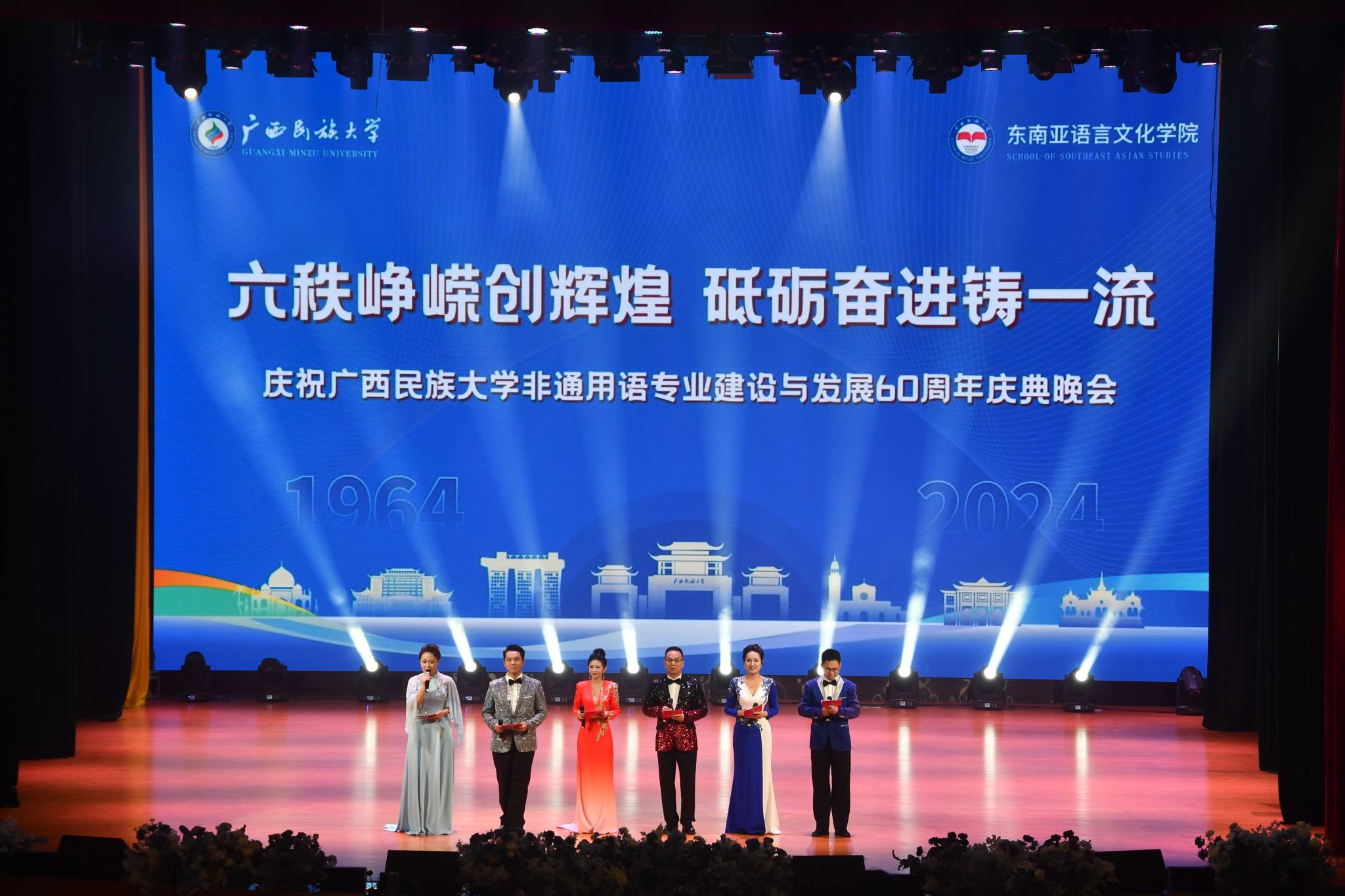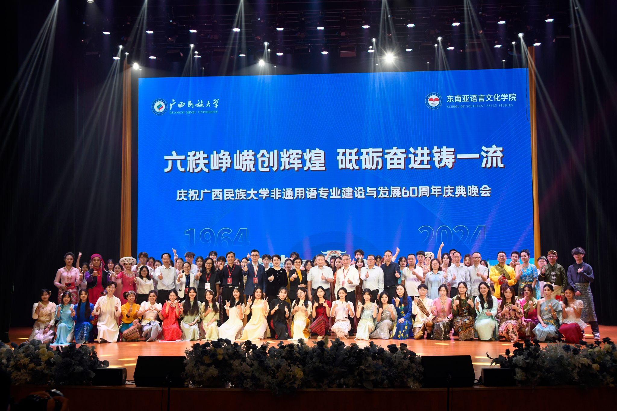 【大学生通讯社报道】11月3日晚,广西民族大学非通用语专业建设与发展60周年庆典晚会在思源湖校区礼堂举行。学校党委副书记陈铭彬,教育部非通用语种类专业教学指导分委员会副主任委员陆生,国内各高校相关领域专家学者及东南亚语言文化学院师生、校友共同观看晚会。