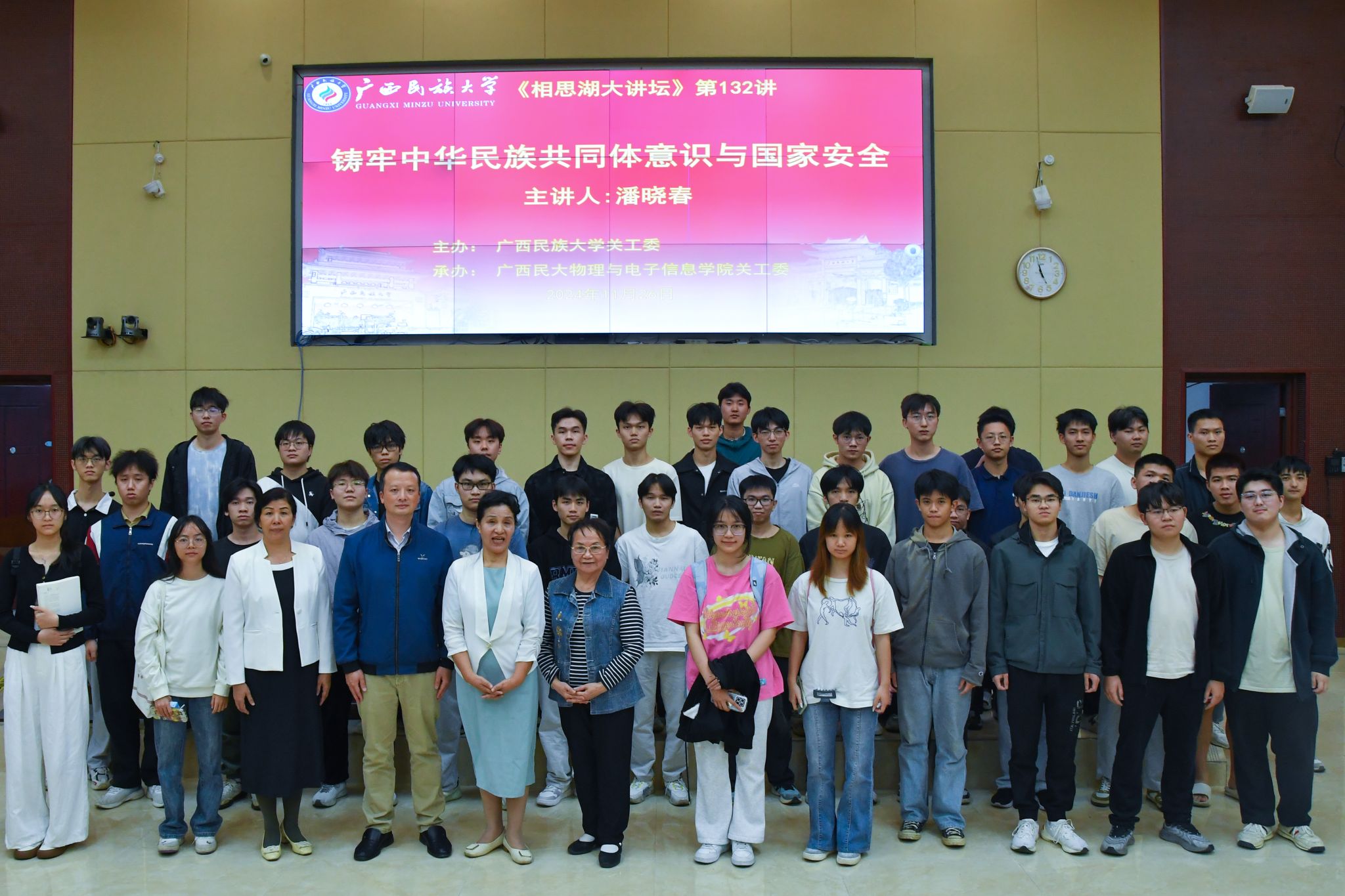 【大学生通讯社报道】11月26日下午,“相思湖大讲坛”第132期——“铸牢中华民族共同体意识与国家安全”专题讲座在创新楼报告厅举行,自治区党委党校退休教授、广西民族大学“学生社会课堂导师”潘晓春主讲。学校关心下一代工作委员会、物理与电子信息学院有关领导和师生代表参加讲座。