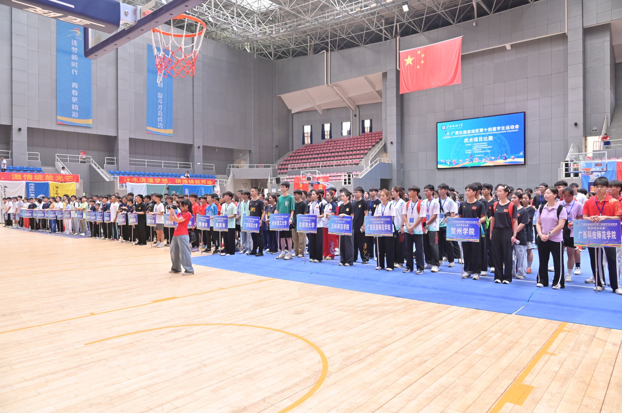 【大学生通讯社报道】7月6日,广西壮族自治区第十四届学生运动会武术项目比赛开幕式在广西民族大学思源湖校区体育馆举行。广西学校体育卫生艺术学会会长、广西民族大学体育与健康科学学院院长蒋东升宣布本次比赛开幕,学校体育与健康科学学院党委书记贺应魁致开幕词,有关比赛裁判员及全区各高校教练员、运动员到场参加。