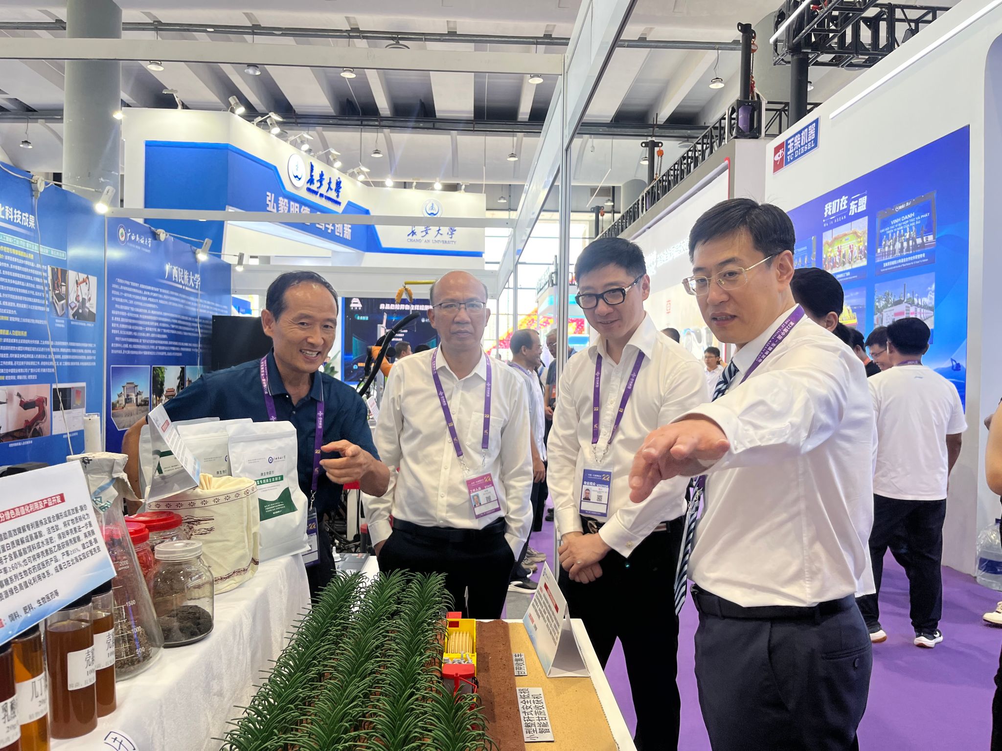 本次参展是学校服务中国-东盟自贸区3.0版建设的具体实践。展出期间,学校科技成果吸引了众多来自东盟国家参展商与现场观众的广泛关注。来自东盟及国内多家企事业单位代表专程前往学校展位交流,围绕非通用语言语料库、智慧医疗、农业科技等领域进行深入探讨,为后续开展务实合作奠定了良好基础。